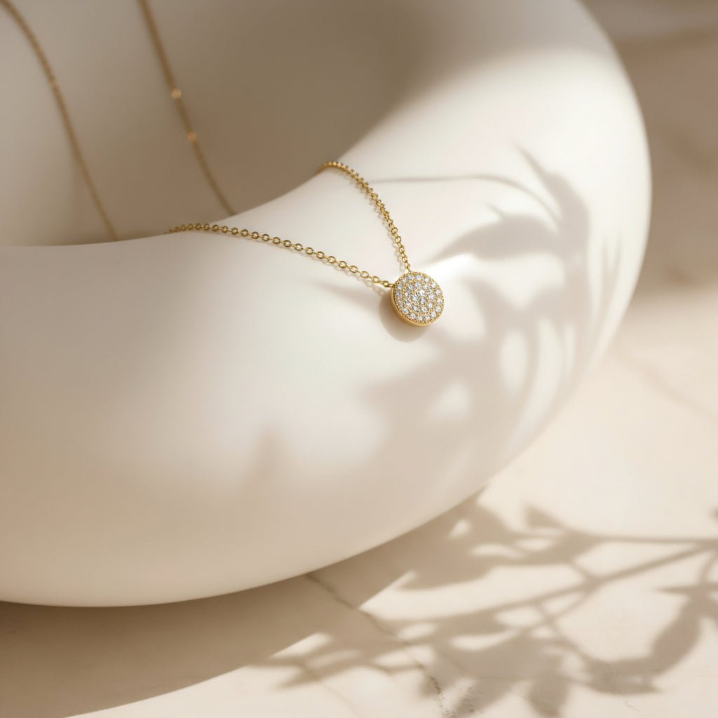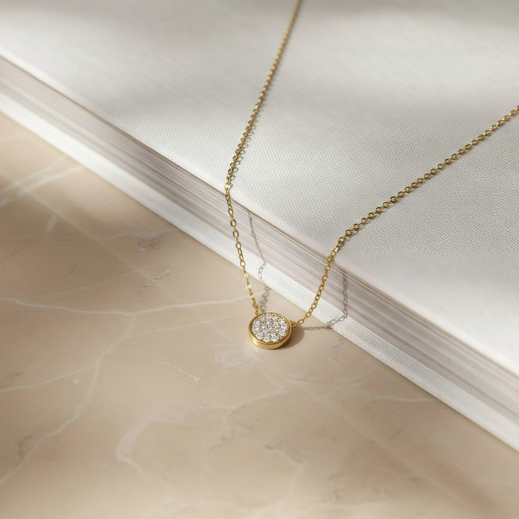 Our Sparkling Charm Ice Necklace offers a special finish that’s designed to catch the light from every angle. Chic and modern is the perfect gift for many occasions. This necklace has set on the circle charm 19 CZ diamonds with a micro pave stone setting technique. Great for everyday wear, wear solo or layer with other necklaces.