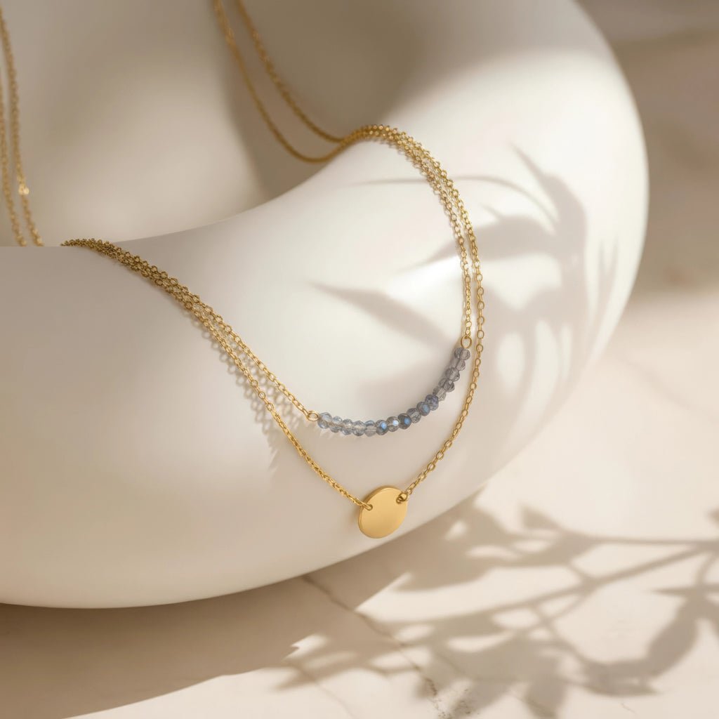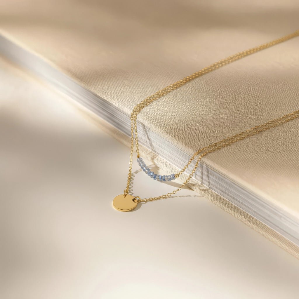 Beautiful touches make this double chain layered necklace one of a kind! Inspired by necklaces worn by stylish women from past generations, this elegant piece features a dainty disc with engraving option that contrasts beautifully with your skin.