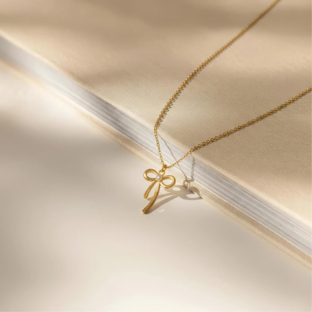 Add a touch of charm with our Gold Bow Pendant Necklace, featuring a delicate ribbon design accented by a dainty pearl center. Feminine and playful, it’s the perfect accessory to elevate any outfit—ideal for gifting or wearing every day with a sweet, elegant twist.