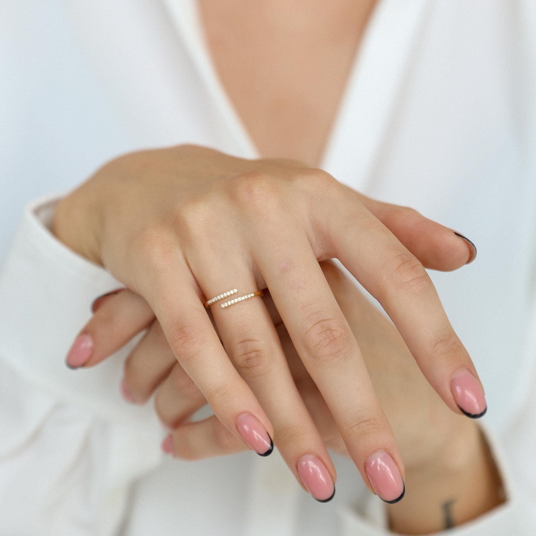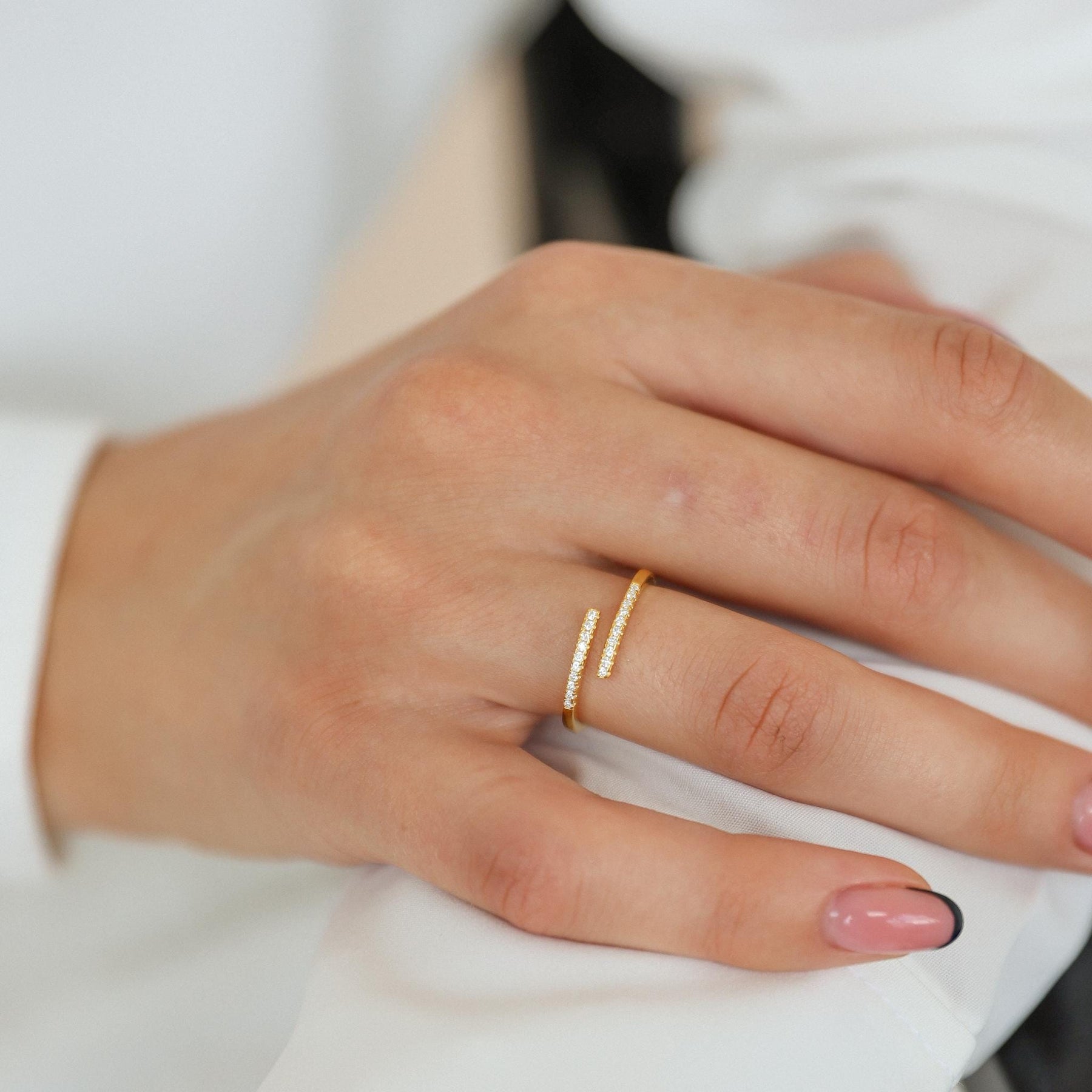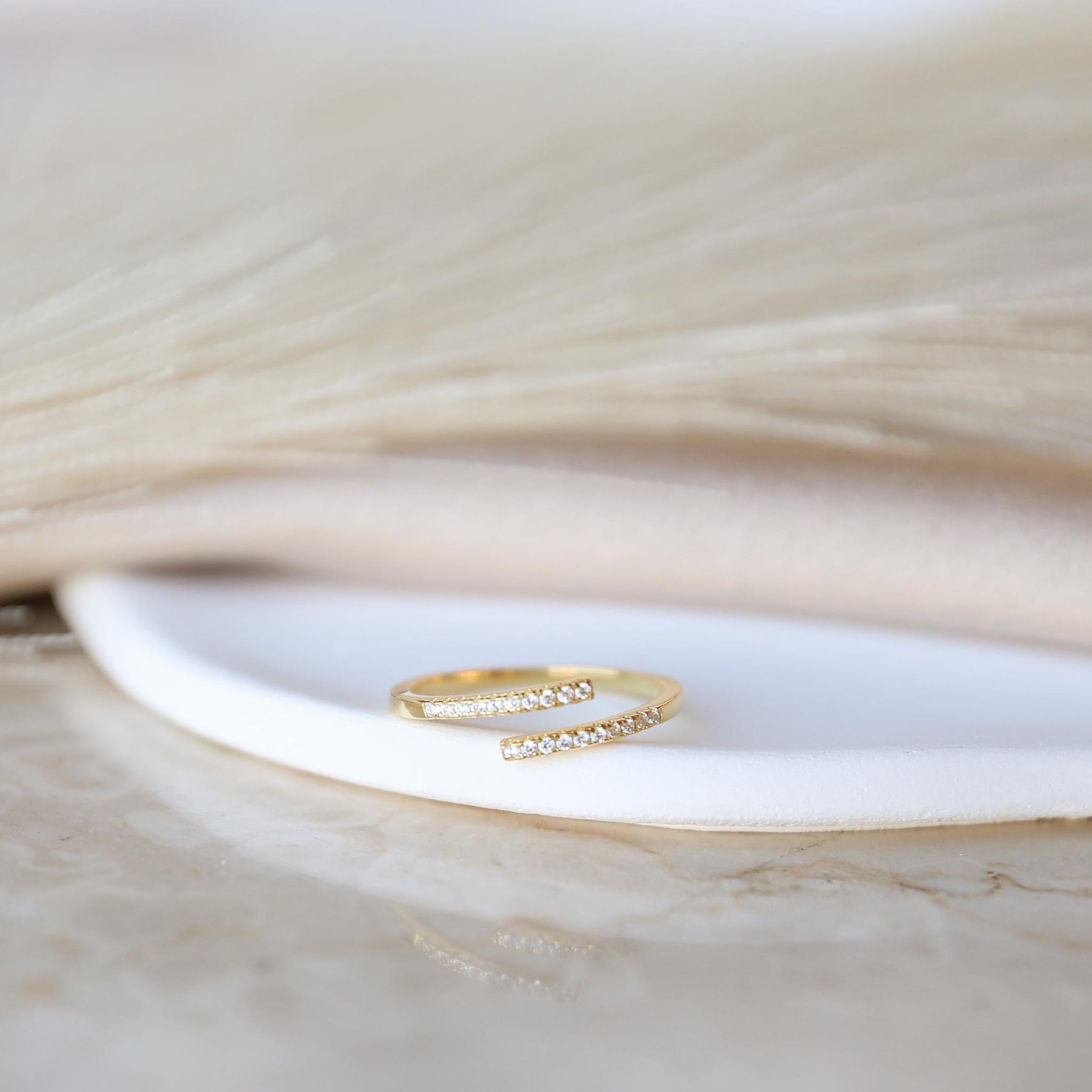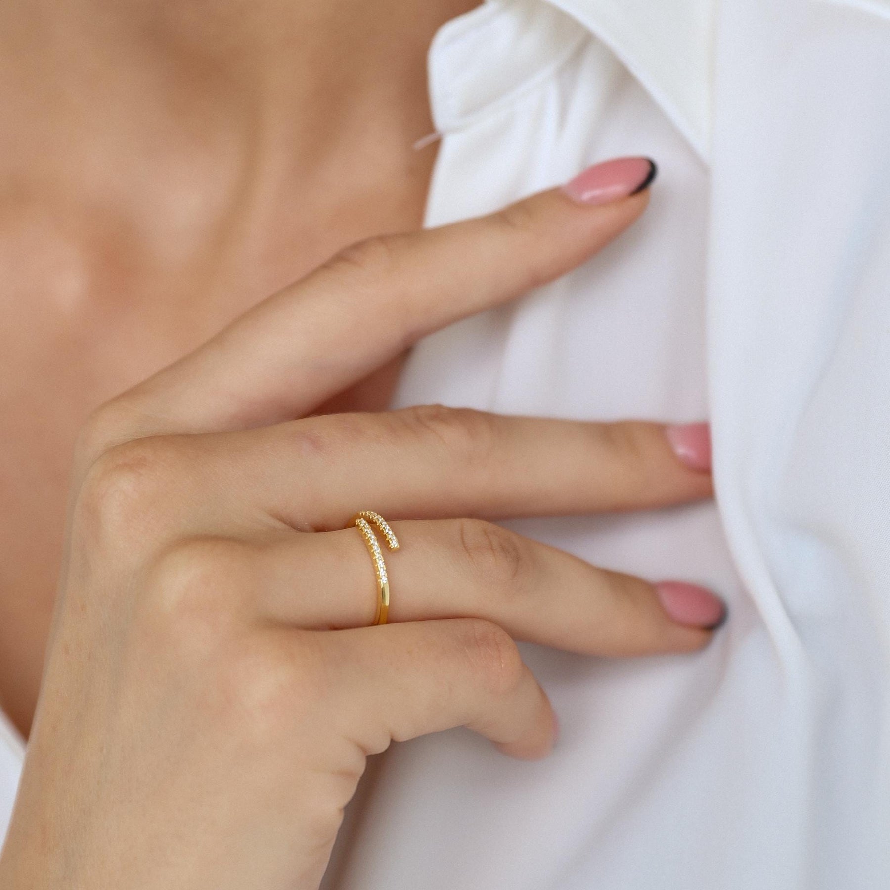 This Adjustable Open Wrap Ring is crafted from high-quality 925 sterling silver and finished with durable gold plating for a bright, elegant shine. The modern open-ended design features two sleek, curved bands adorned with sparkling cubic zirconia crystals, creating a refined and stylish look. Fully adjustable and comfortable to wear, this ring is perfect for everyday elegance or adding a subtle touch of glamour to any outfit.