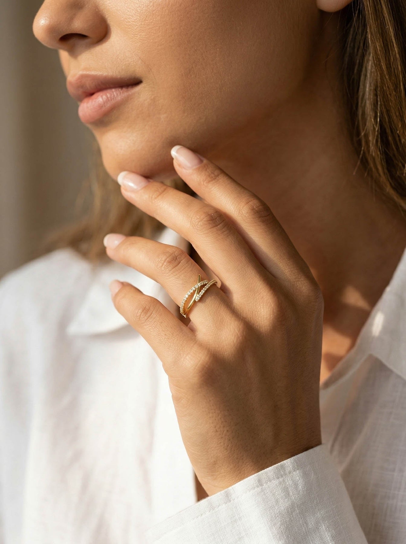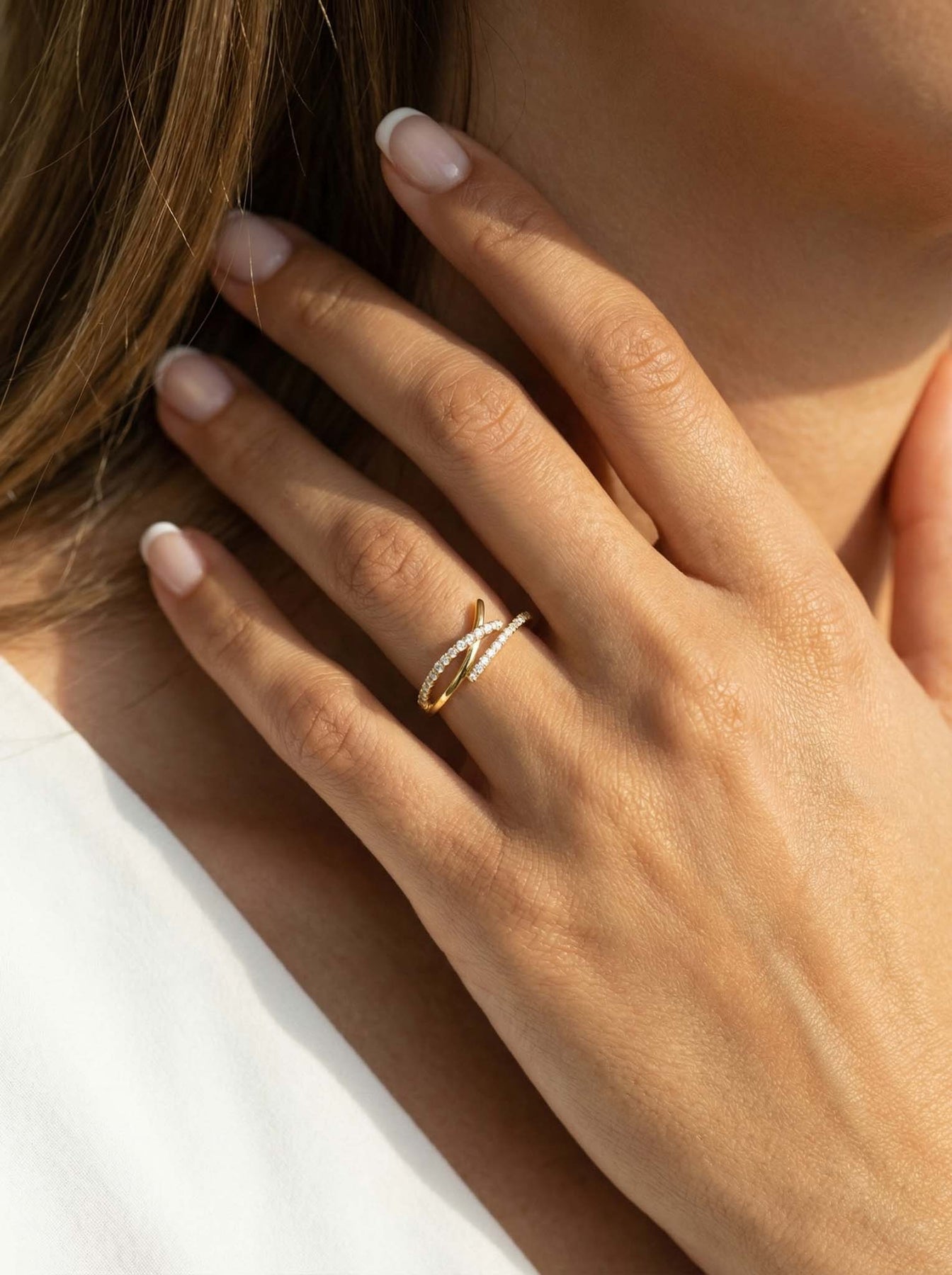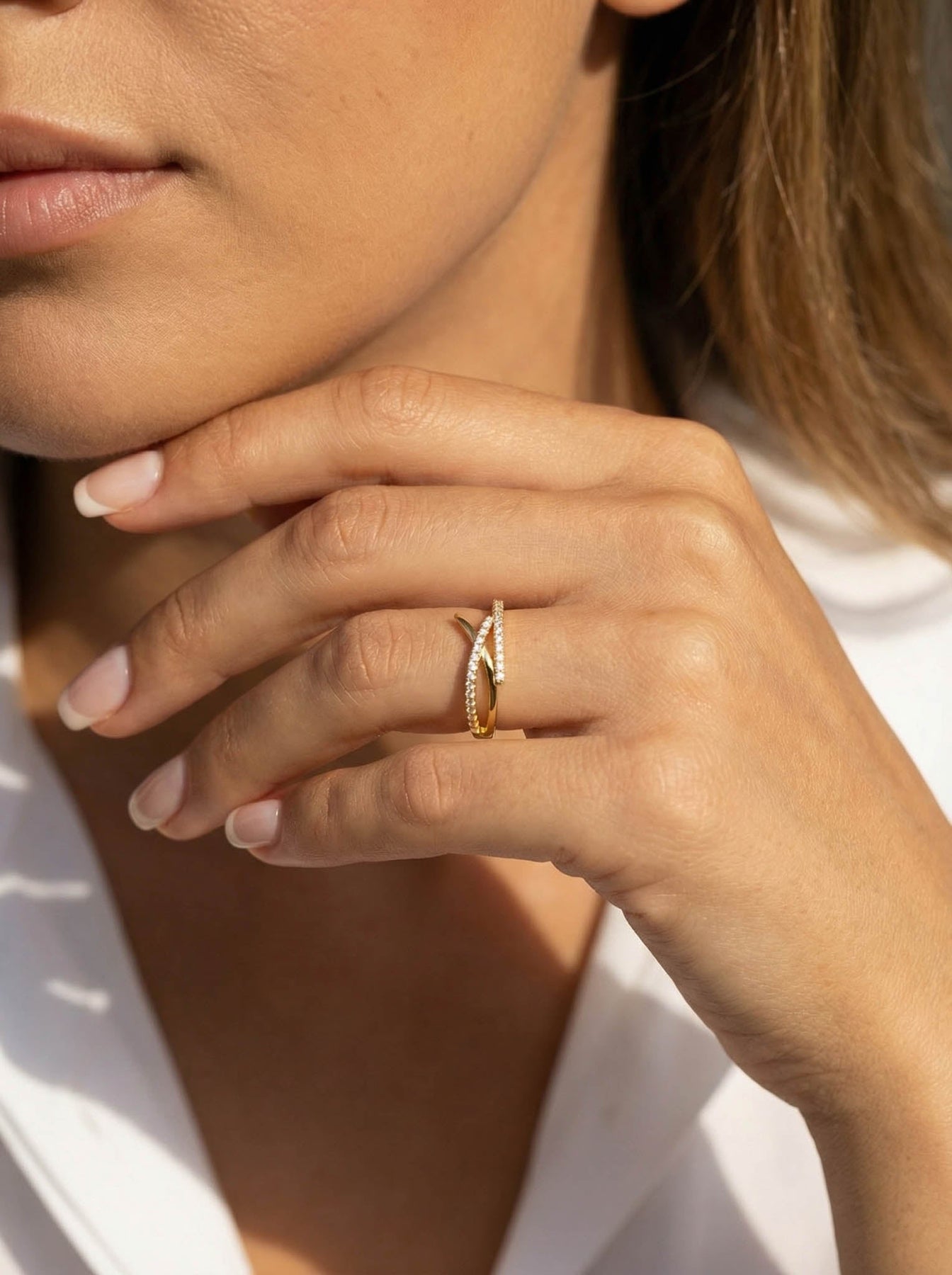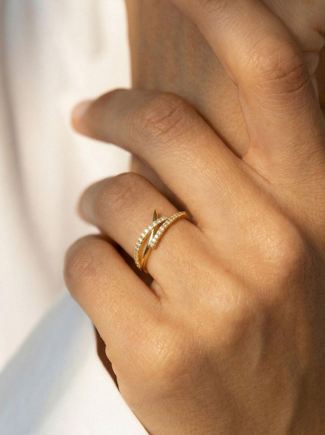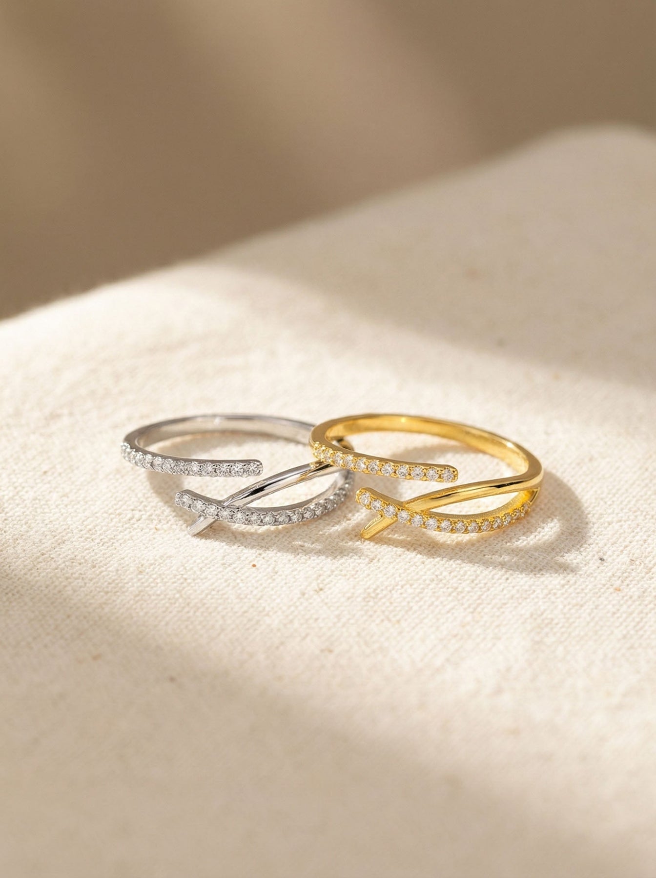 This elegant Criss Cross Ring is crafted from genuine 925 sterling silver and finished with a premium gold plating for a radiant shine. The modern crossover design features two sleek bands—one smooth and one adorned with sparkling zircon stones—creating a sophisticated layered look in a single piece.