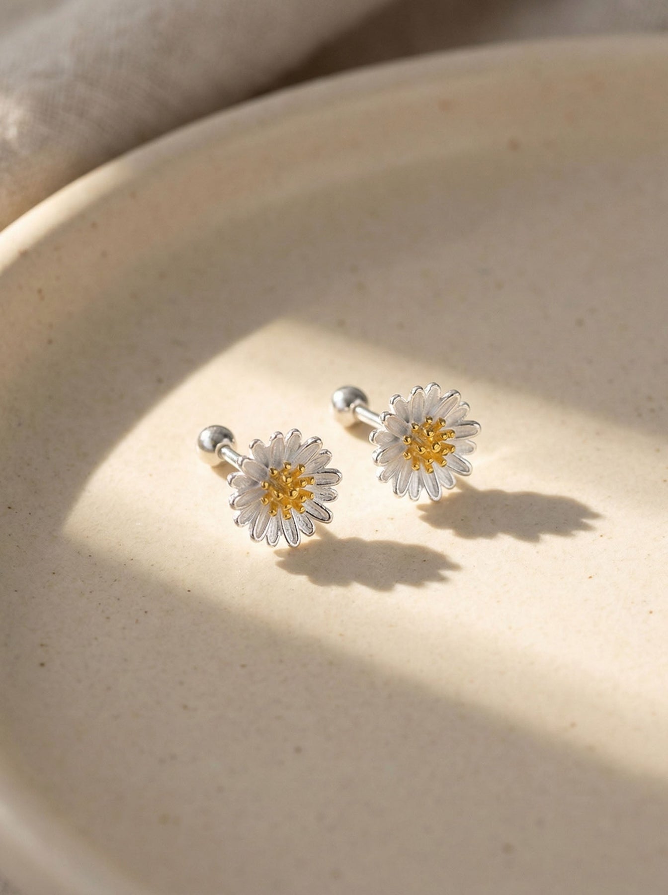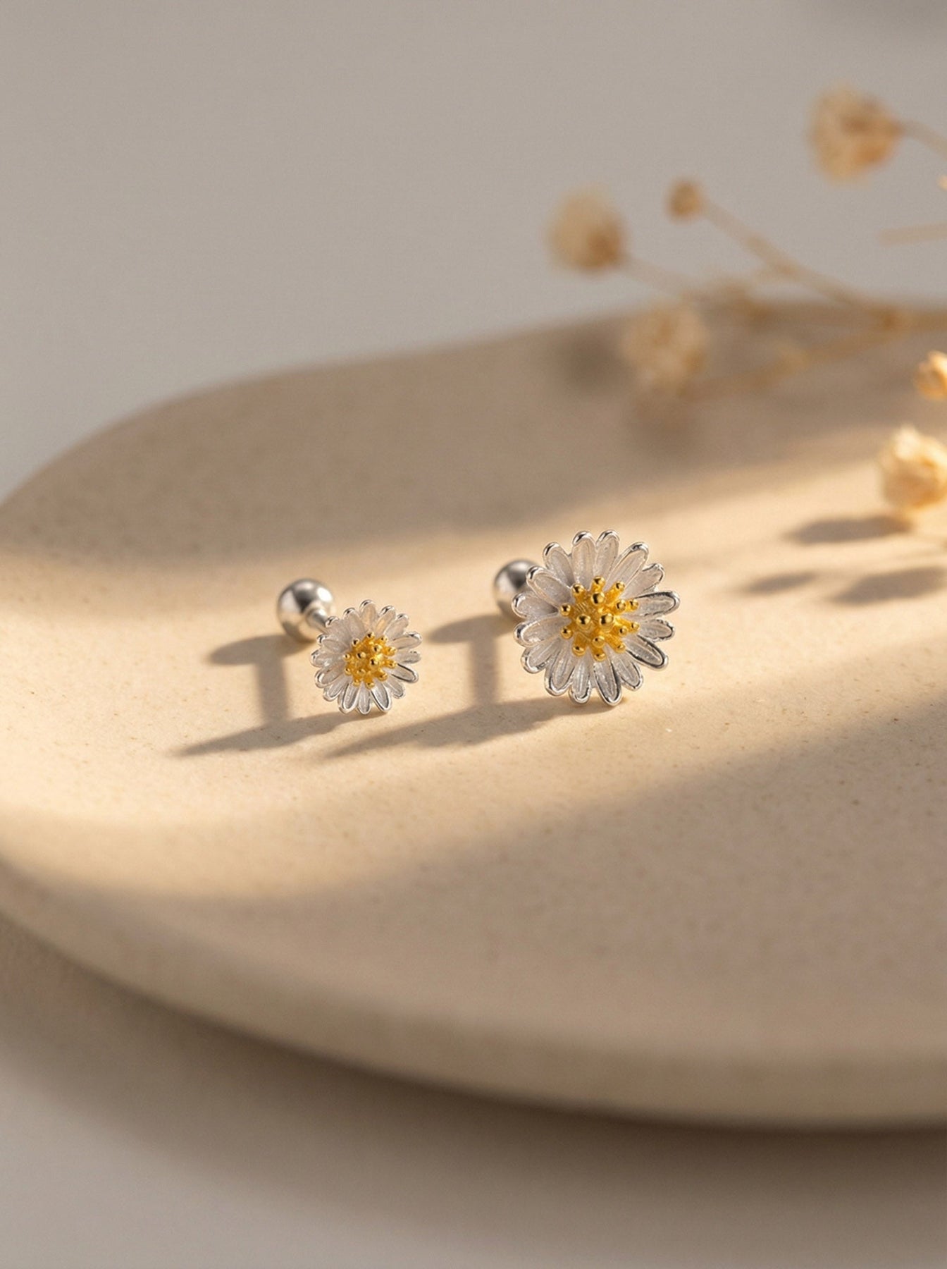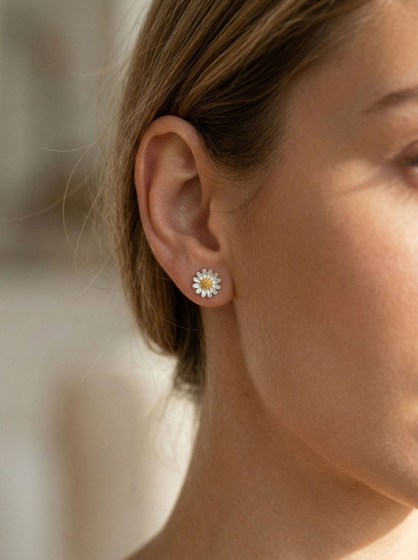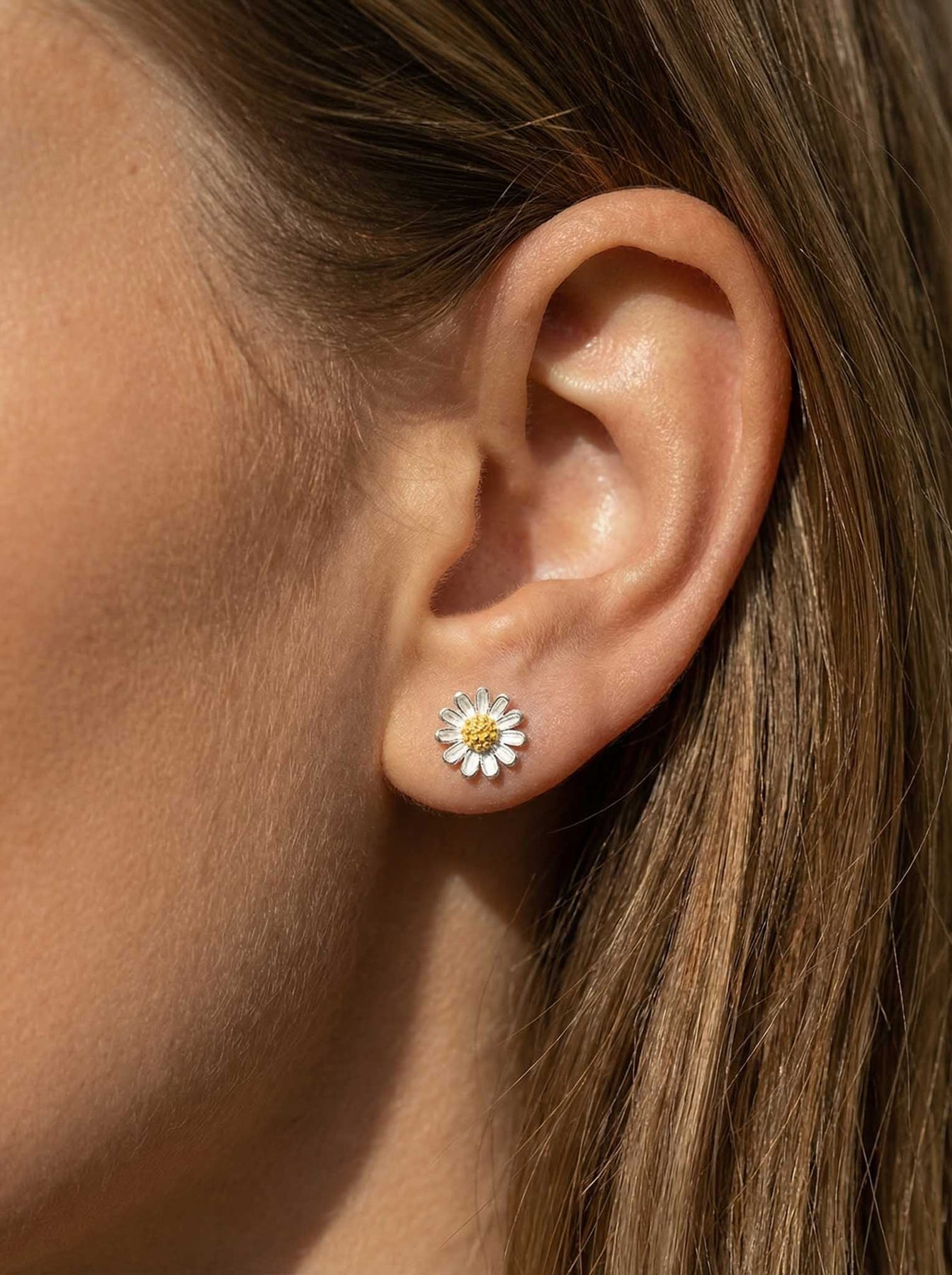 Bring a touch of spring to your everyday look with these Daisy Flower Stud Earrings, crafted from premium 925 sterling silver. Designed with a charming two-tone finish, each stud features shimmering white petals and a detailed golden center, creating a beautifully realistic daisy effect. The model in the photo is wearing the 8mm earrings.