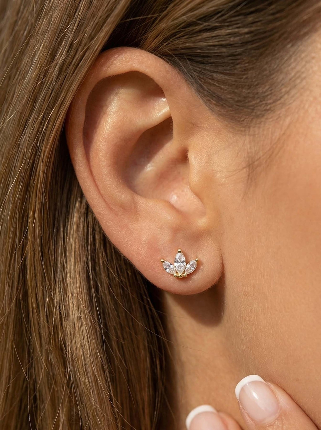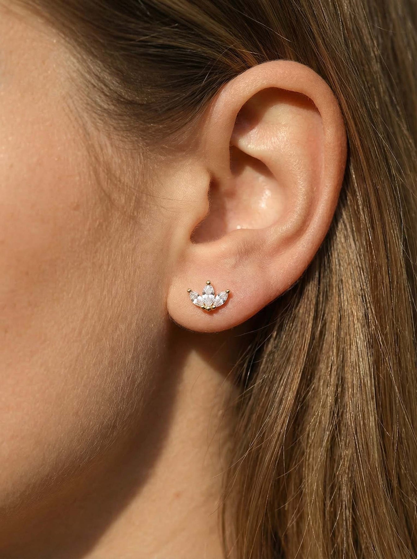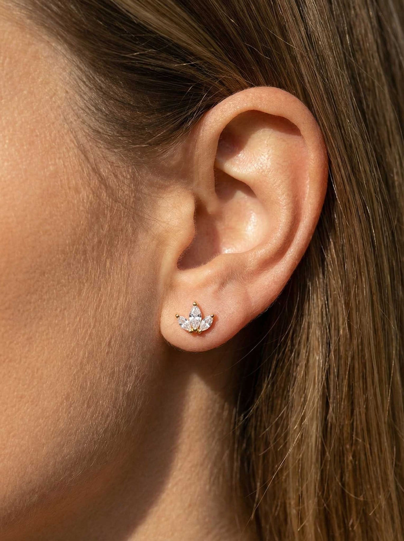 These elegant Diamond Stud Earrings feature three sparkling marquise-cut cubic zirconia stones arranged in a refined crown-like design. Crafted from premium 925 sterling silver and finished with high-quality gold plating, they offer a luxurious shine while remaining lightweight and comfortable for everyday wear.