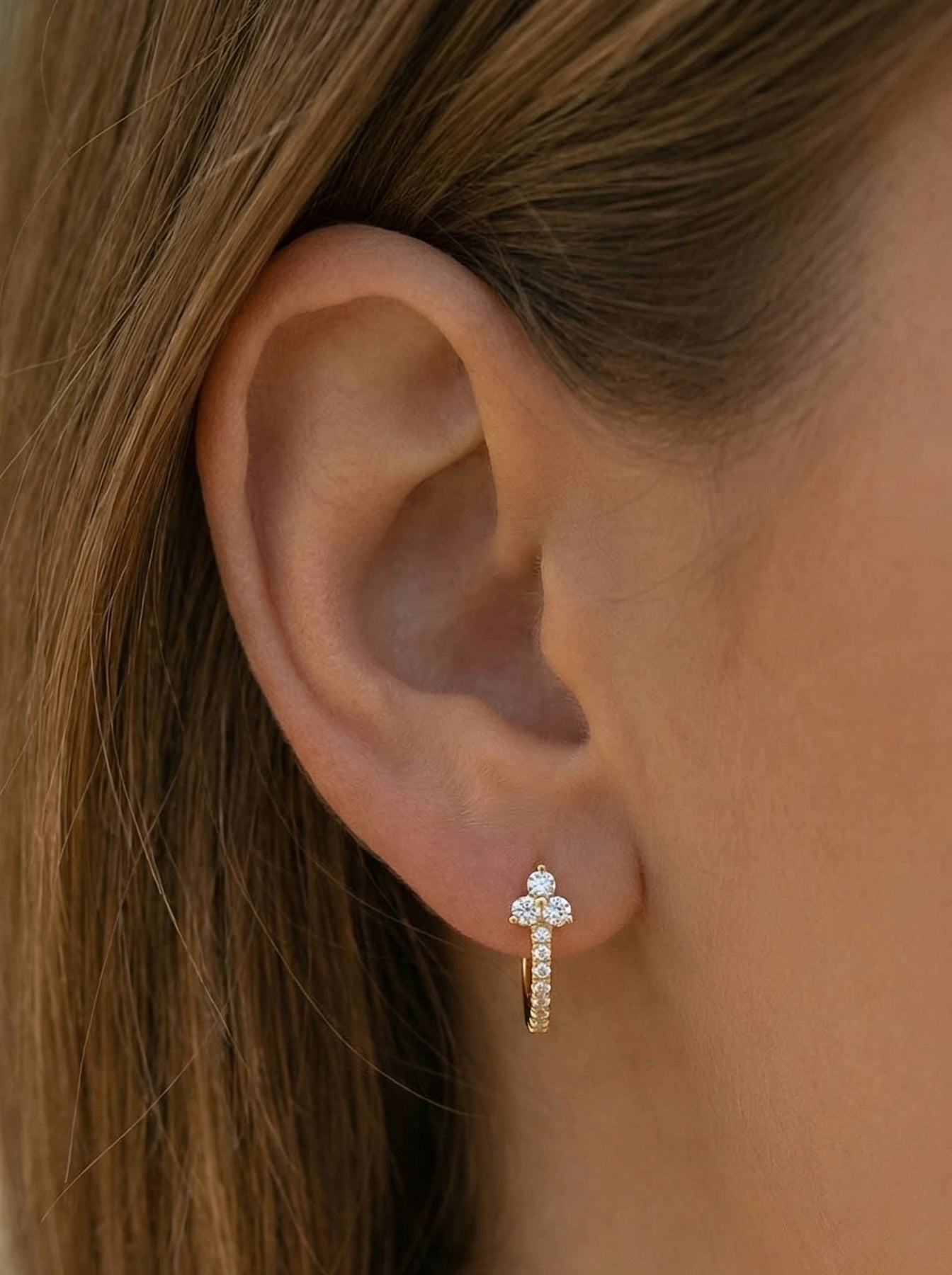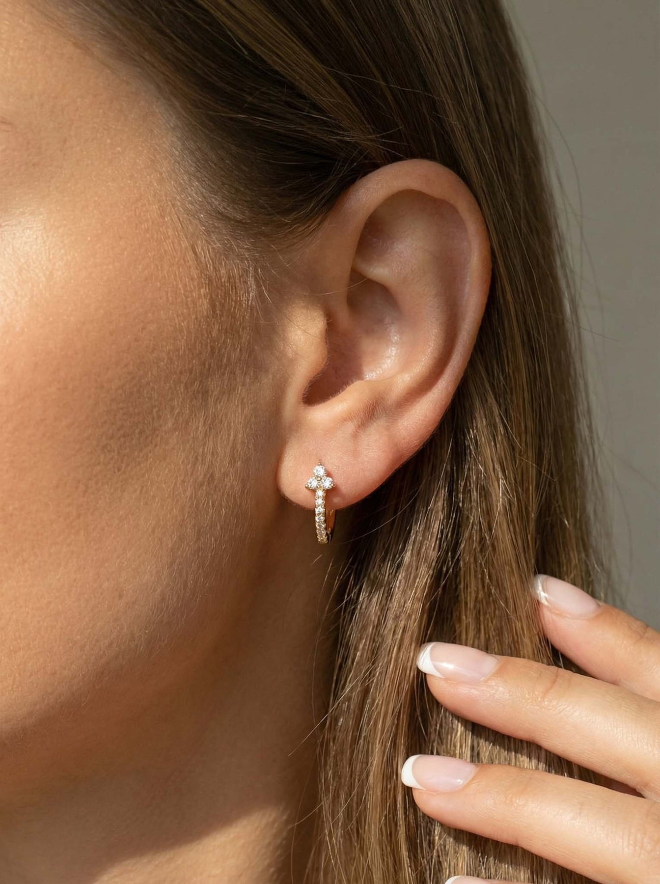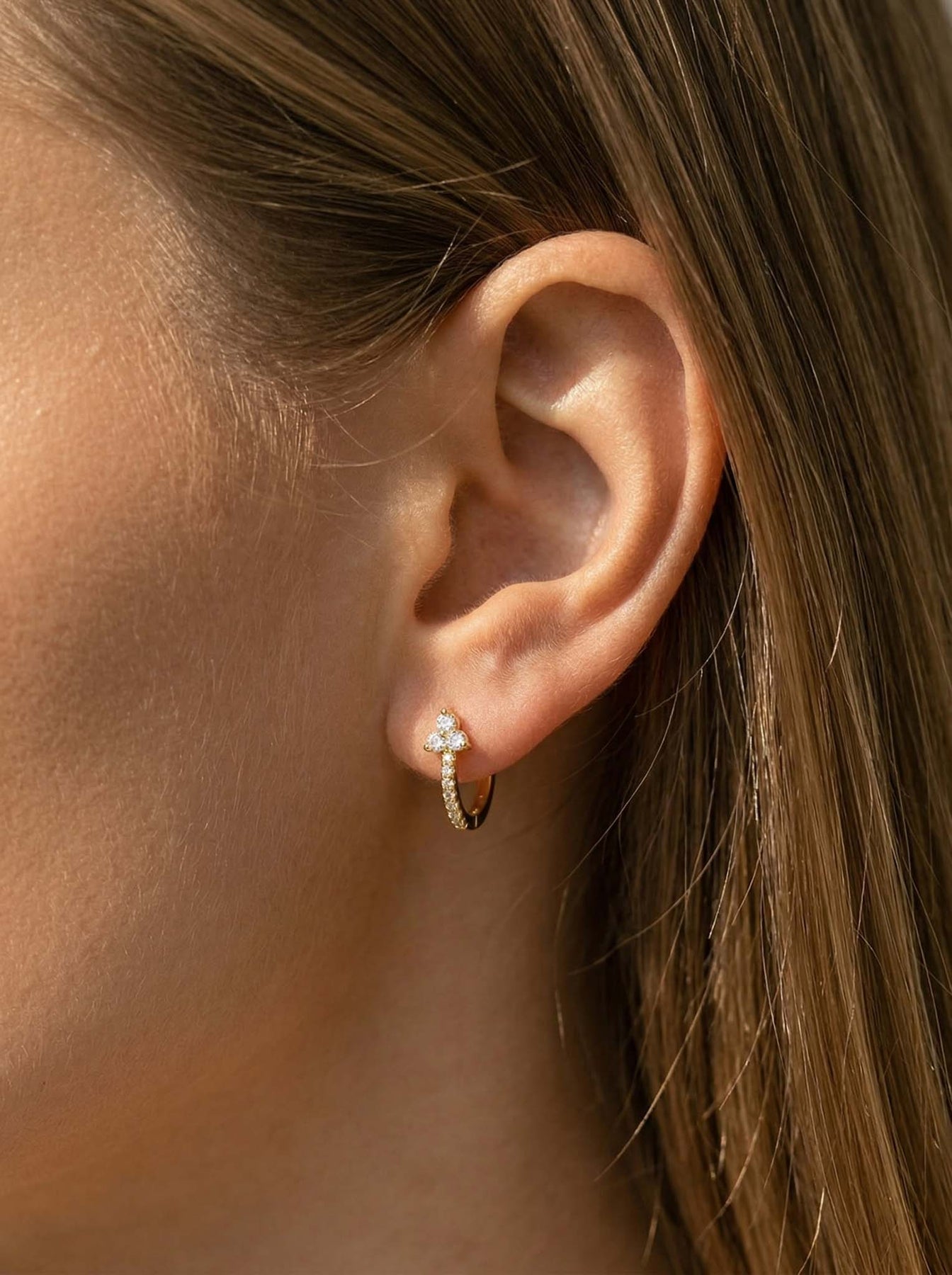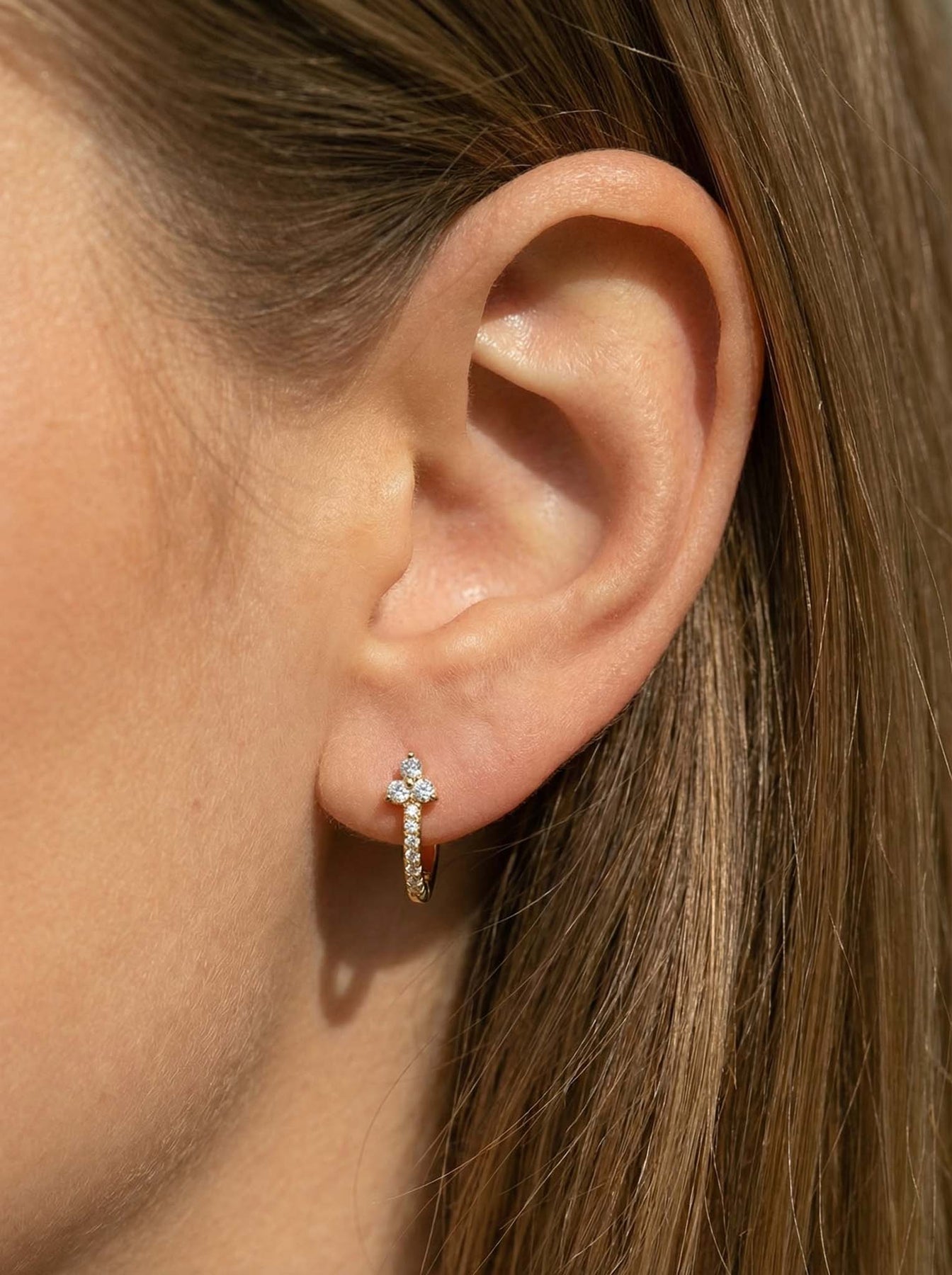 Elevate your everyday style with these elegant Floral Diamond Huggie Hoop Earrings crafted from premium 925 sterling silver. Each hoop features a delicate flower-shaped cluster of sparkling cubic zirconia stones paired with a sleek gold-plated finish, creating a timeless and feminine look perfect for any occasion.