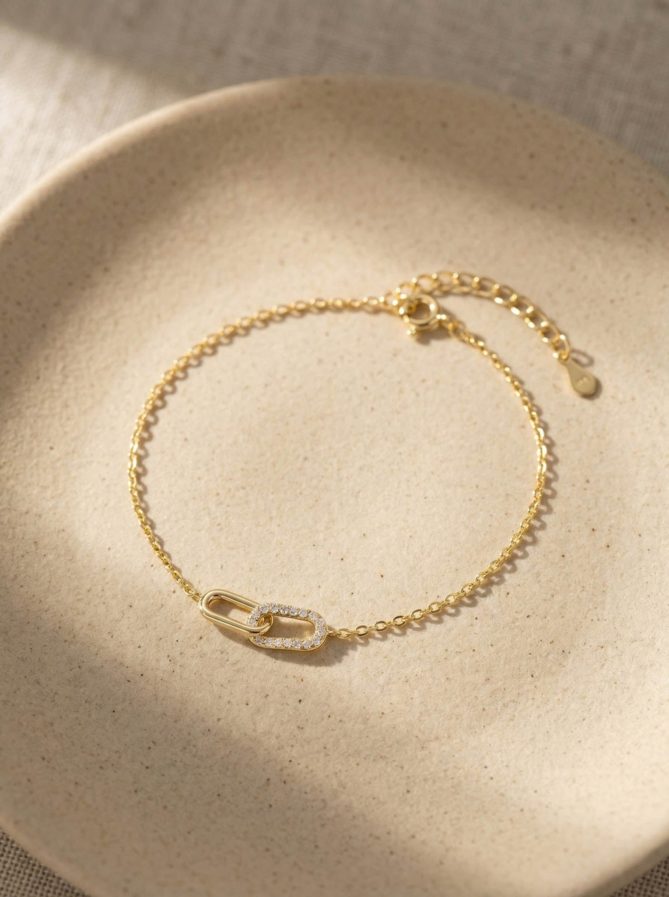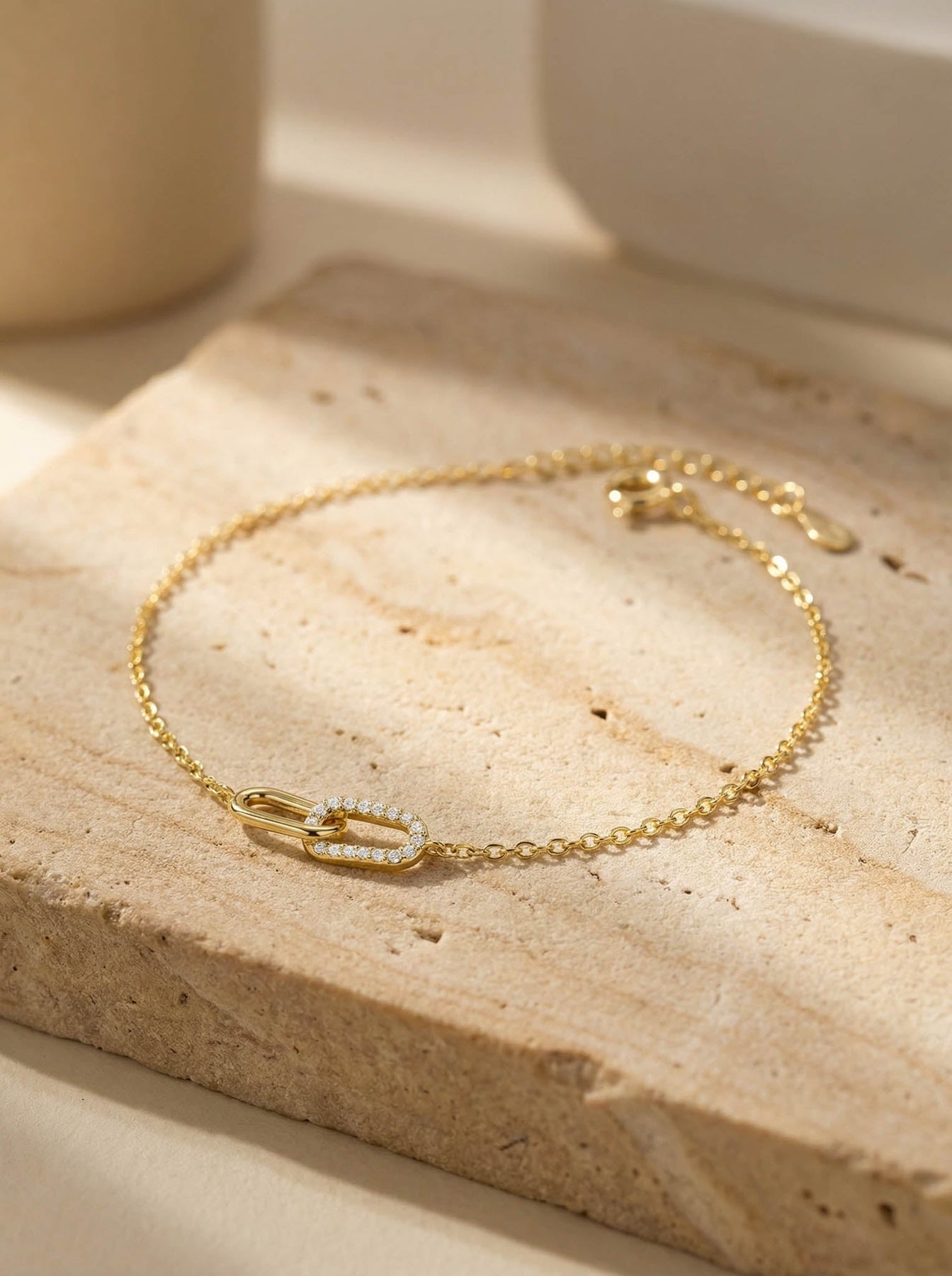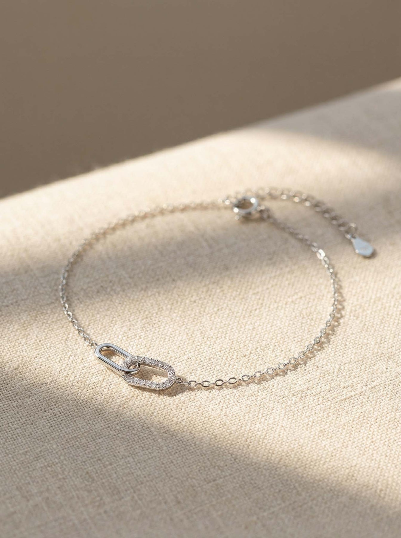 This Interlocking Bracelet features a modern, elegant design with two interlinked charms—one polished gold-plated and the other adorned with sparkling diamond-like cubic zirconia crystals. Crafted from high-quality 925 sterling silver, this bracelet adds a refined and timeless touch to any jewelry collection.