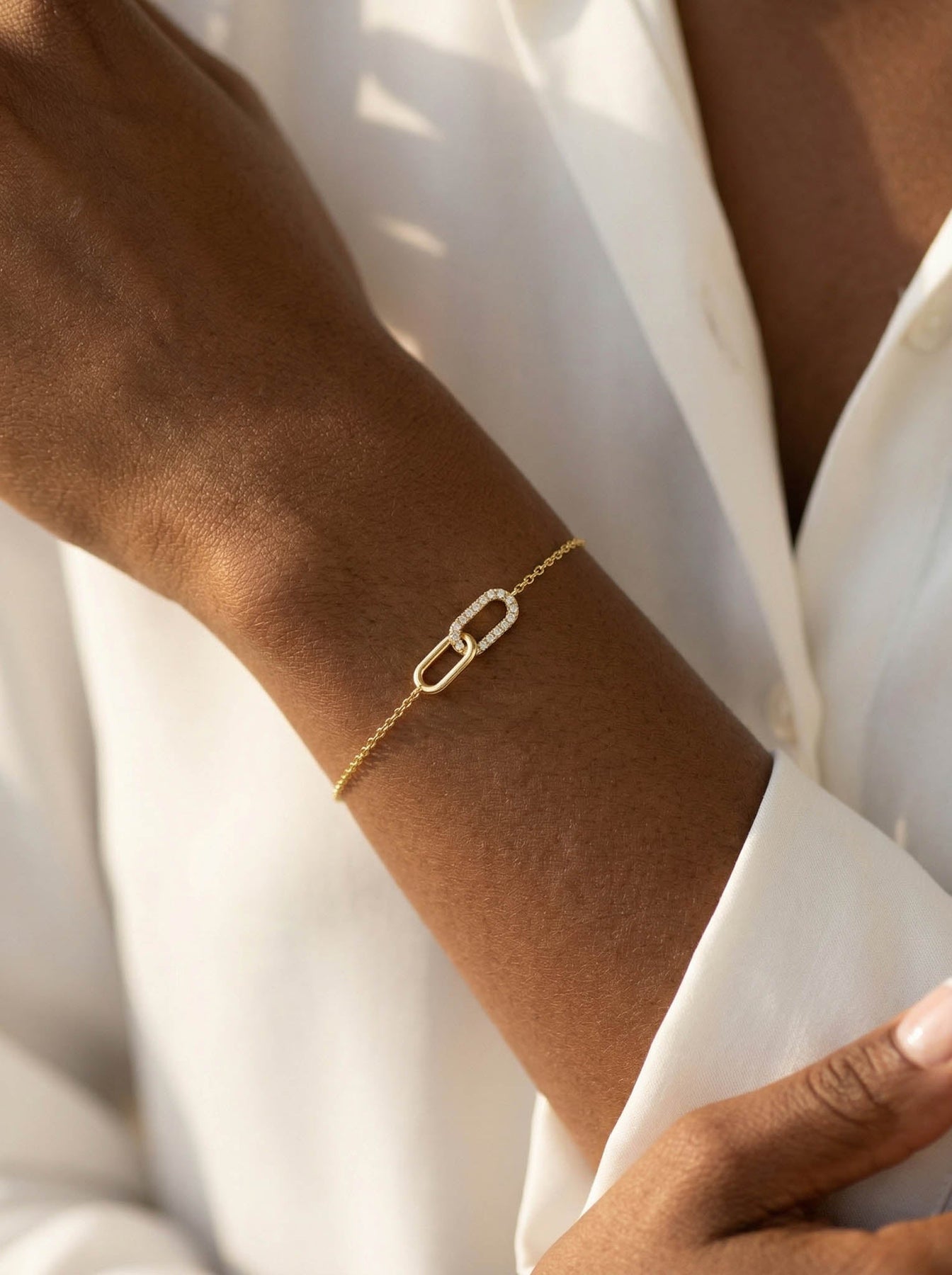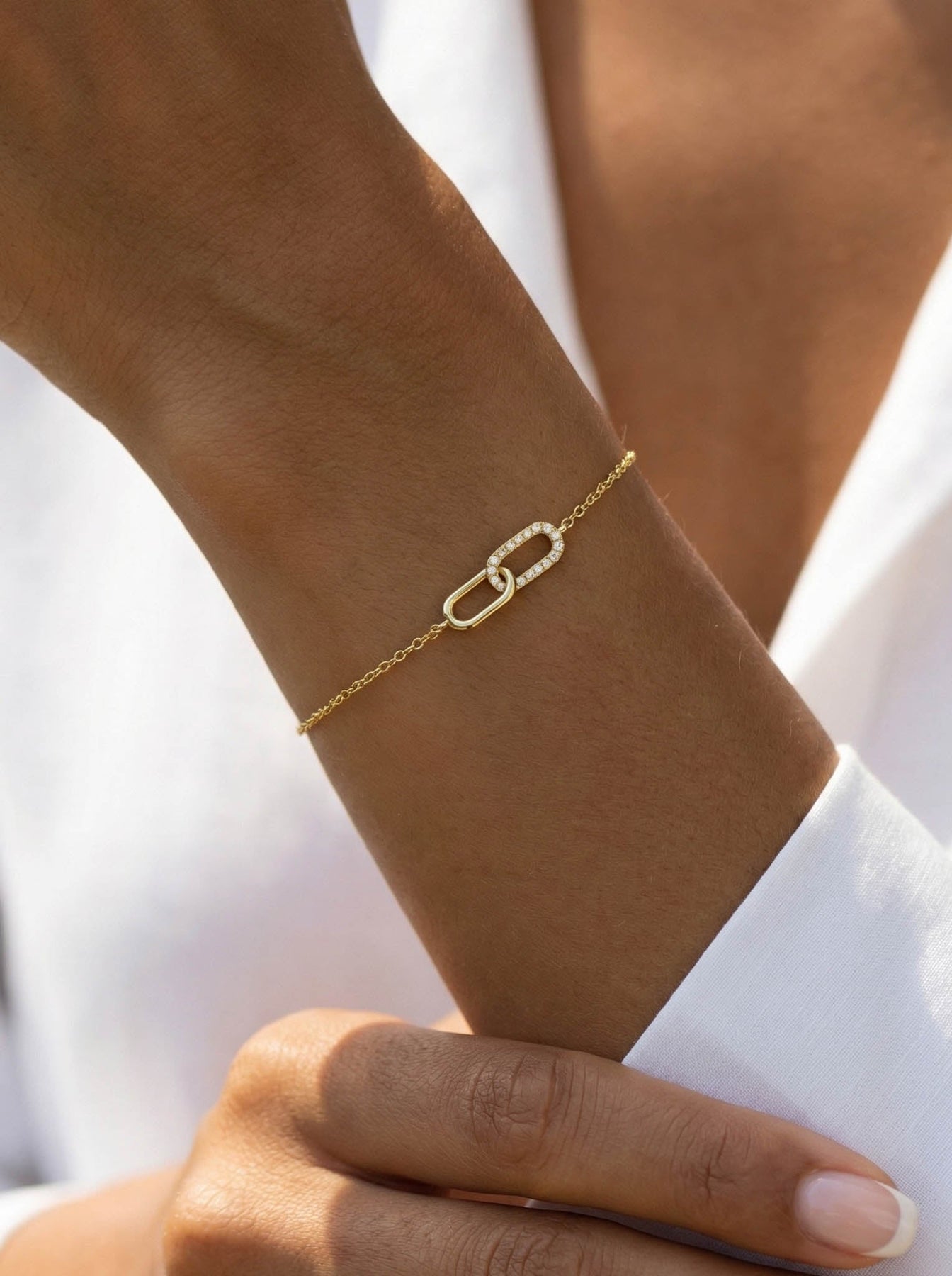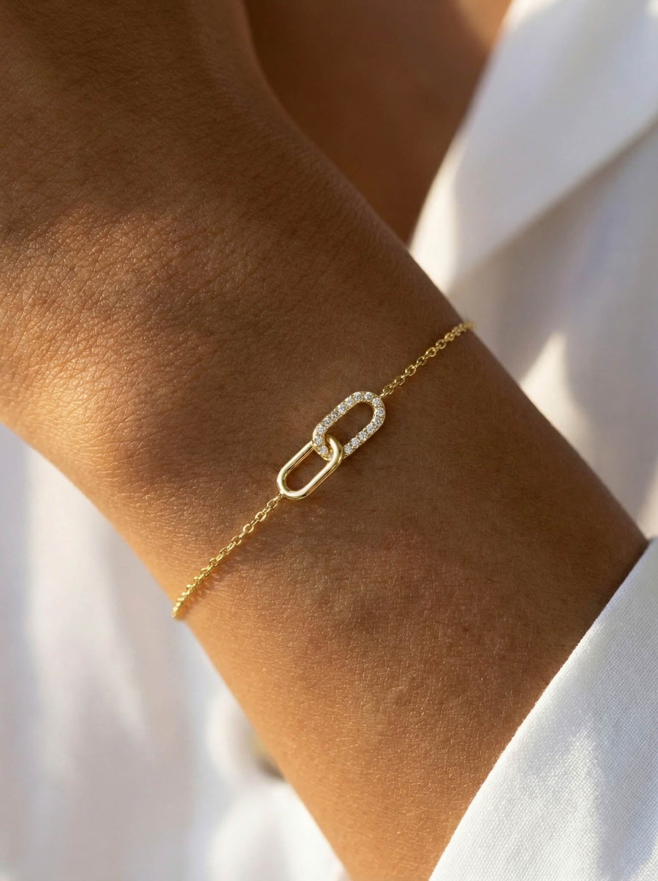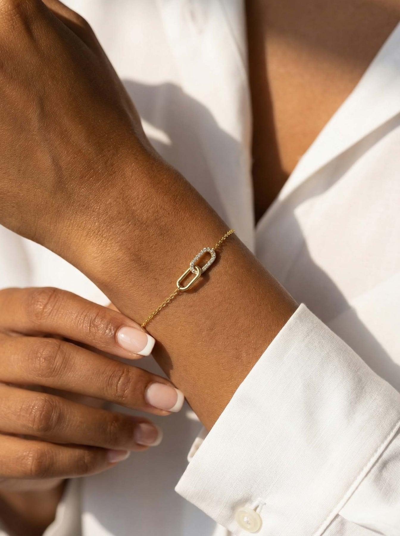 This Interlocking Bracelet features a modern, elegant design with two interlinked charms—one polished gold-plated and the other adorned with sparkling diamond-like cubic zirconia crystals. Crafted from high-quality 925 sterling silver, this bracelet adds a refined and timeless touch to any jewelry collection.