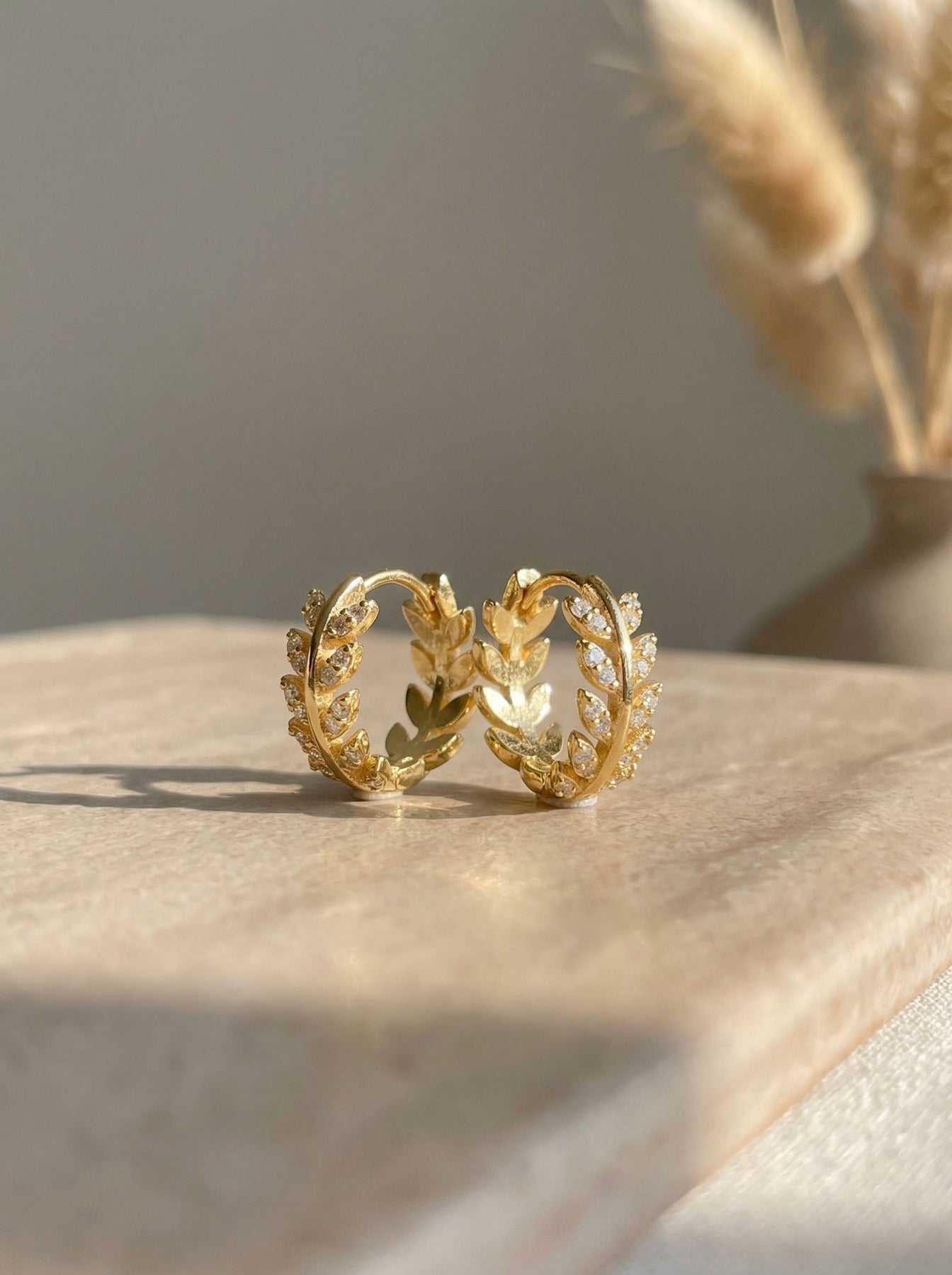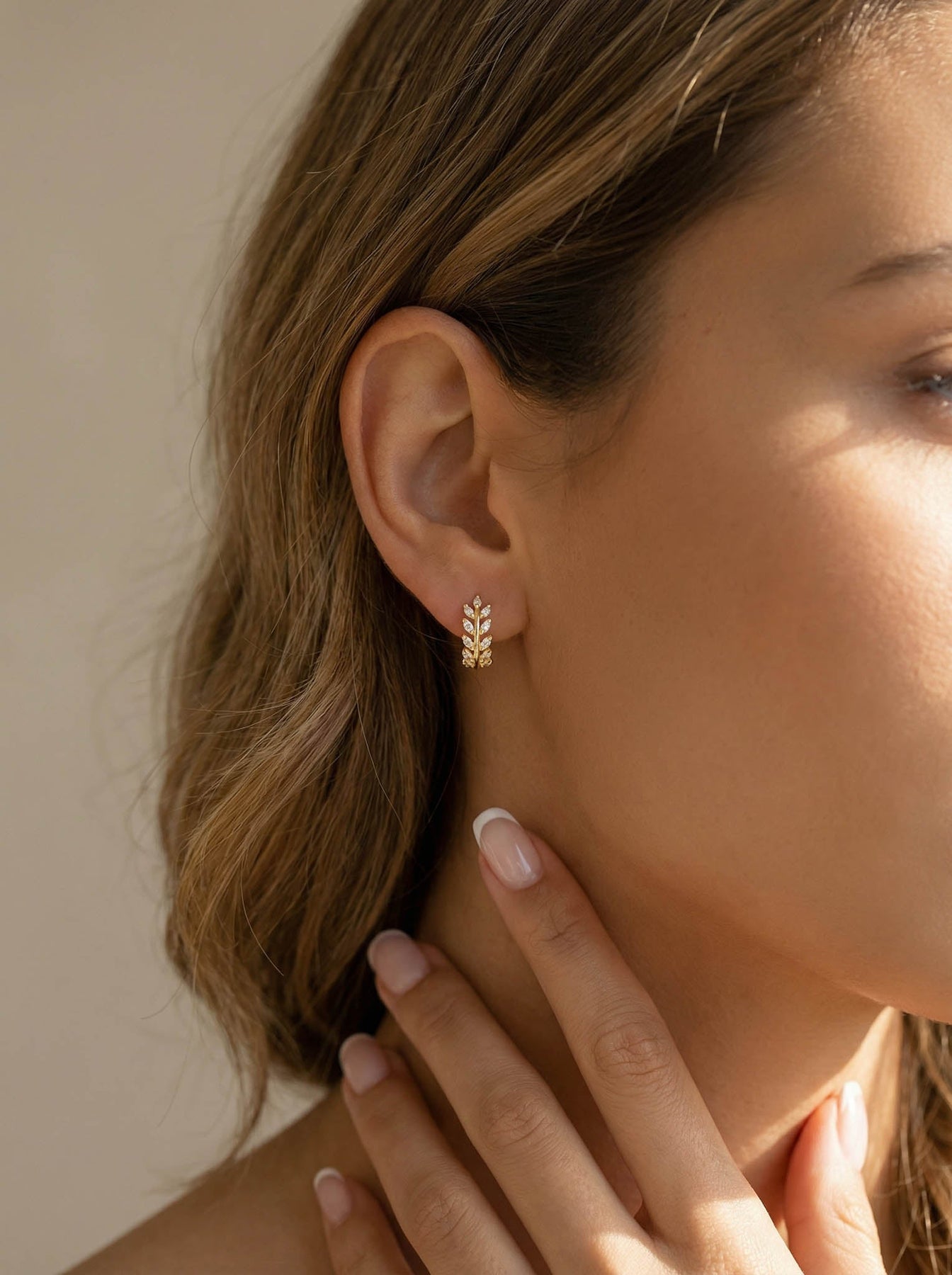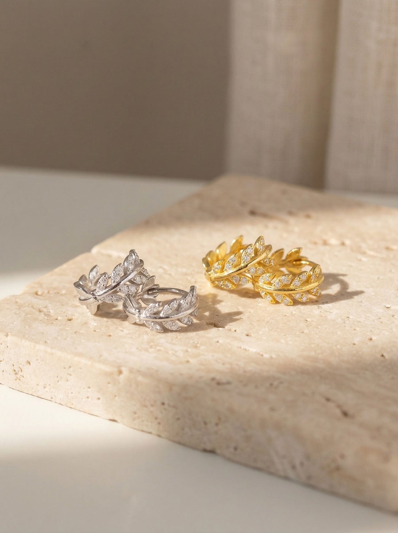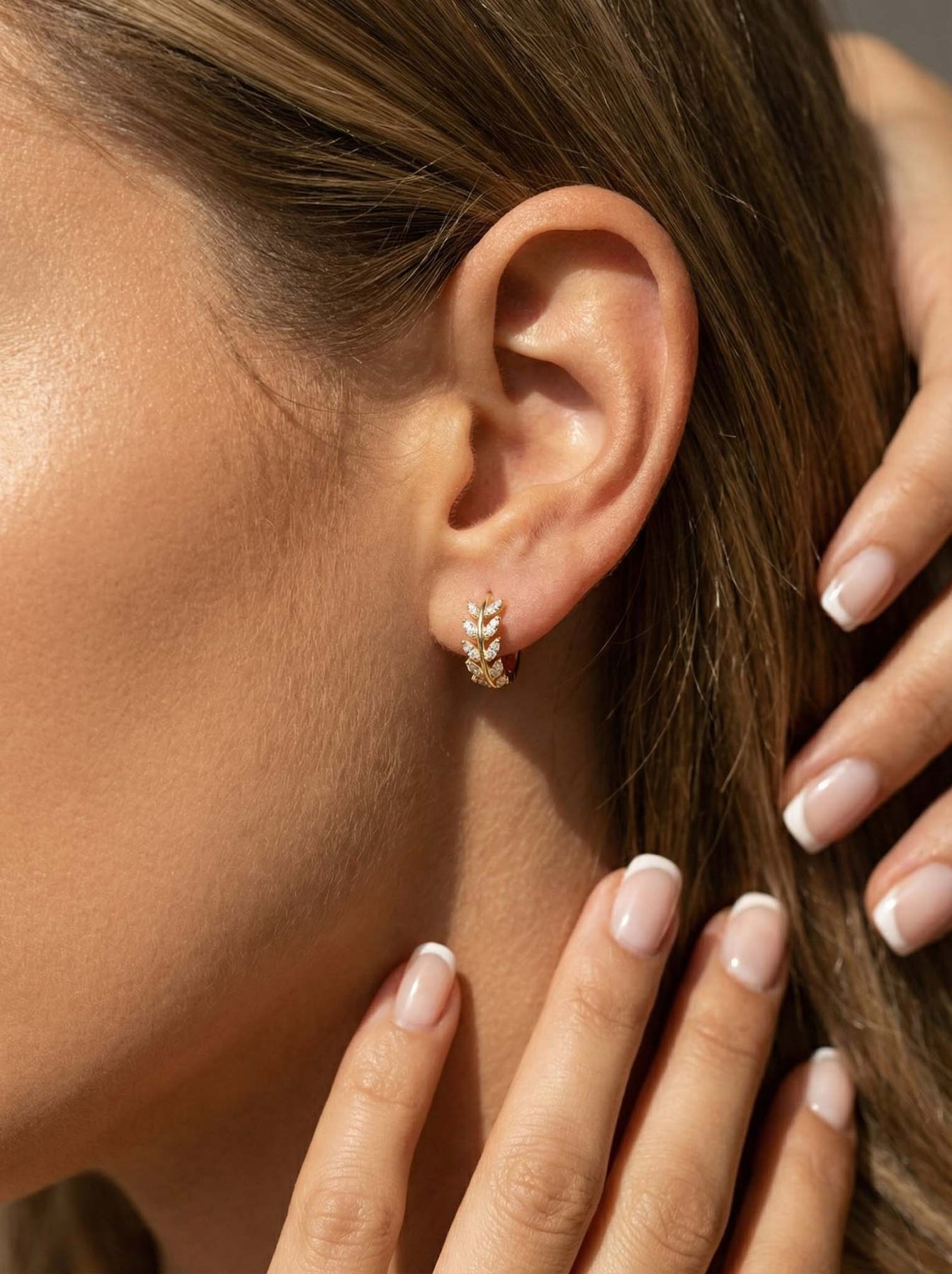 These Leaf Hoop Earrings with Crystals are crafted from premium 925 sterling silver. Each hoop features an elegant leaf-inspired design adorned with sparkling cubic zirconia stones, creating a refined, nature-inspired look.
