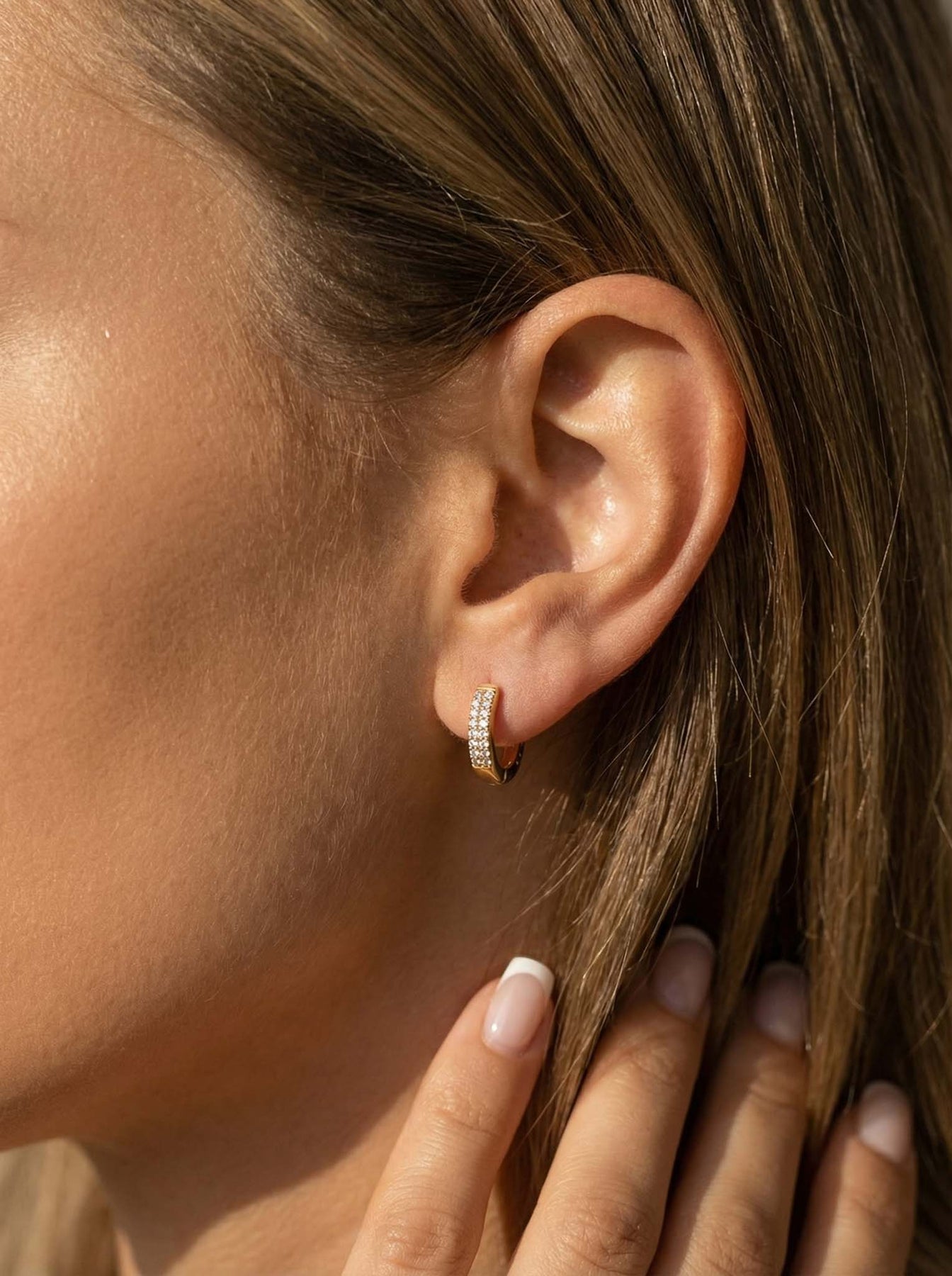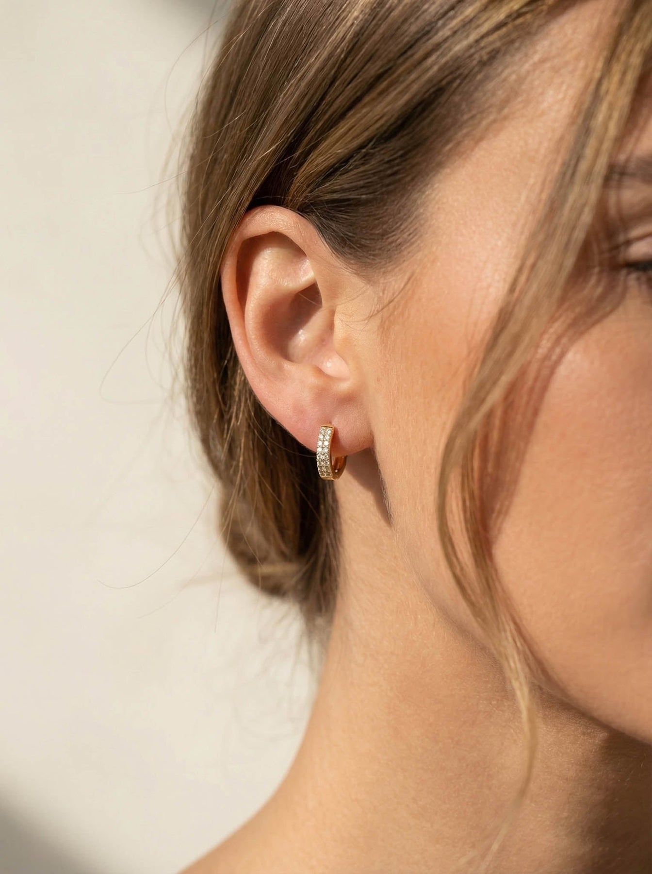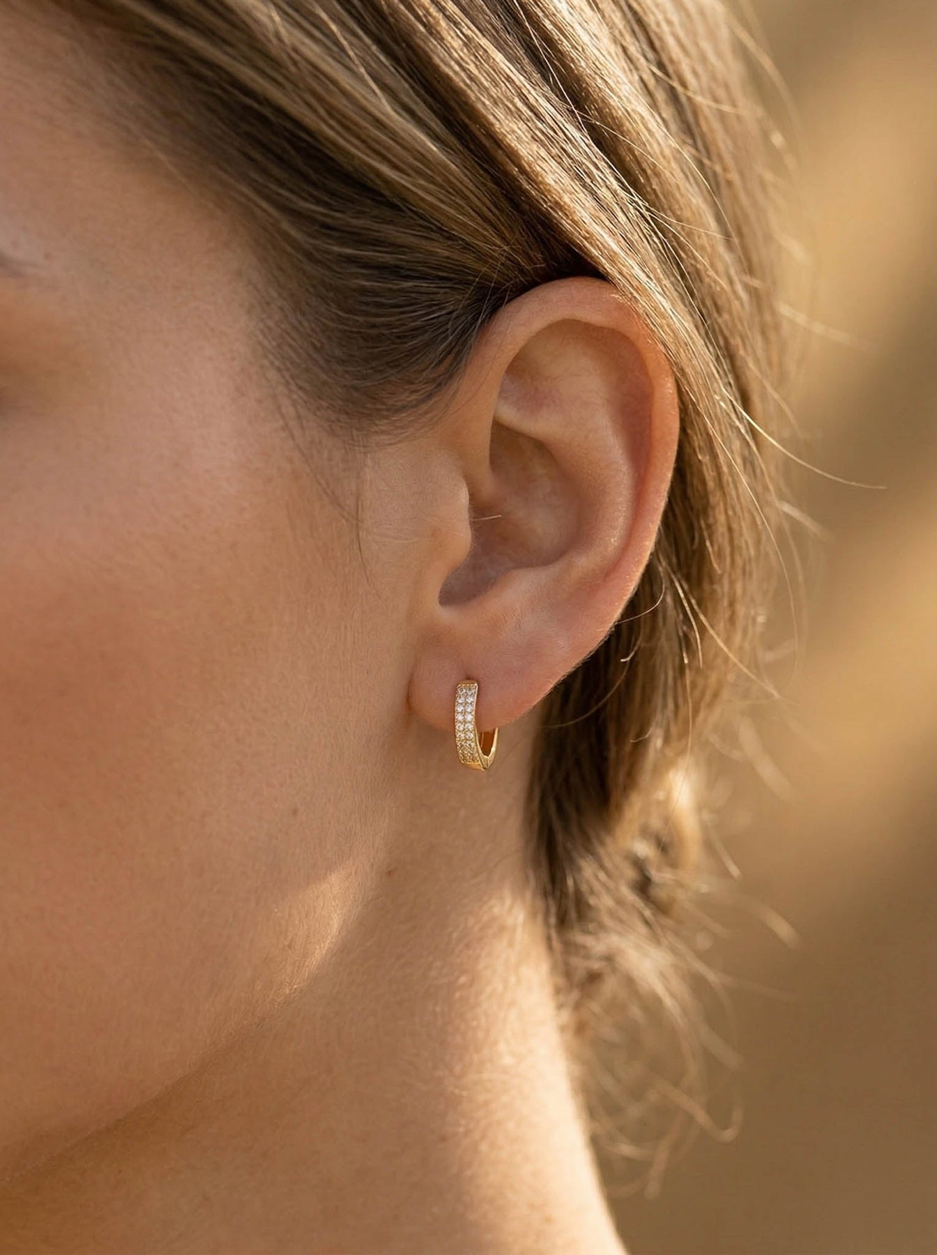 These Pavé Huggie Hoop Earrings are crafted from premium 925 sterling silver. Each hoop is adorned with sparkling cubic zirconia stones arranged in a pavé setting, creating a subtle yet eye-catching sparkle perfect for everyday wear. Lightweight, comfortable, and easy to pair with any outfit, these small gold hoops are a timeless jewelry essential.