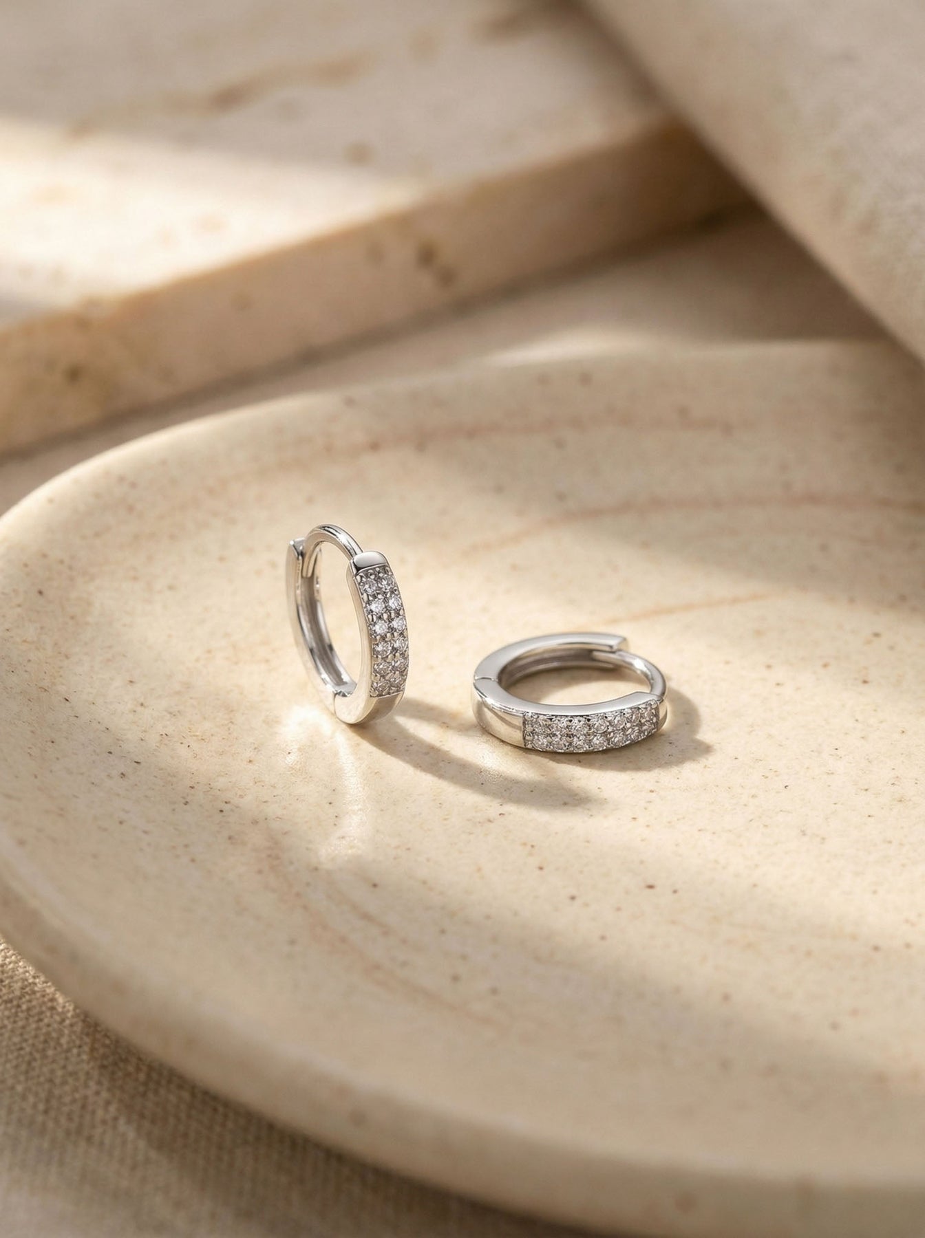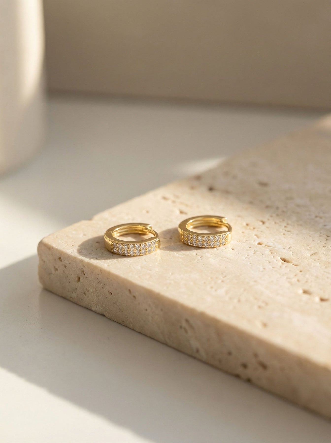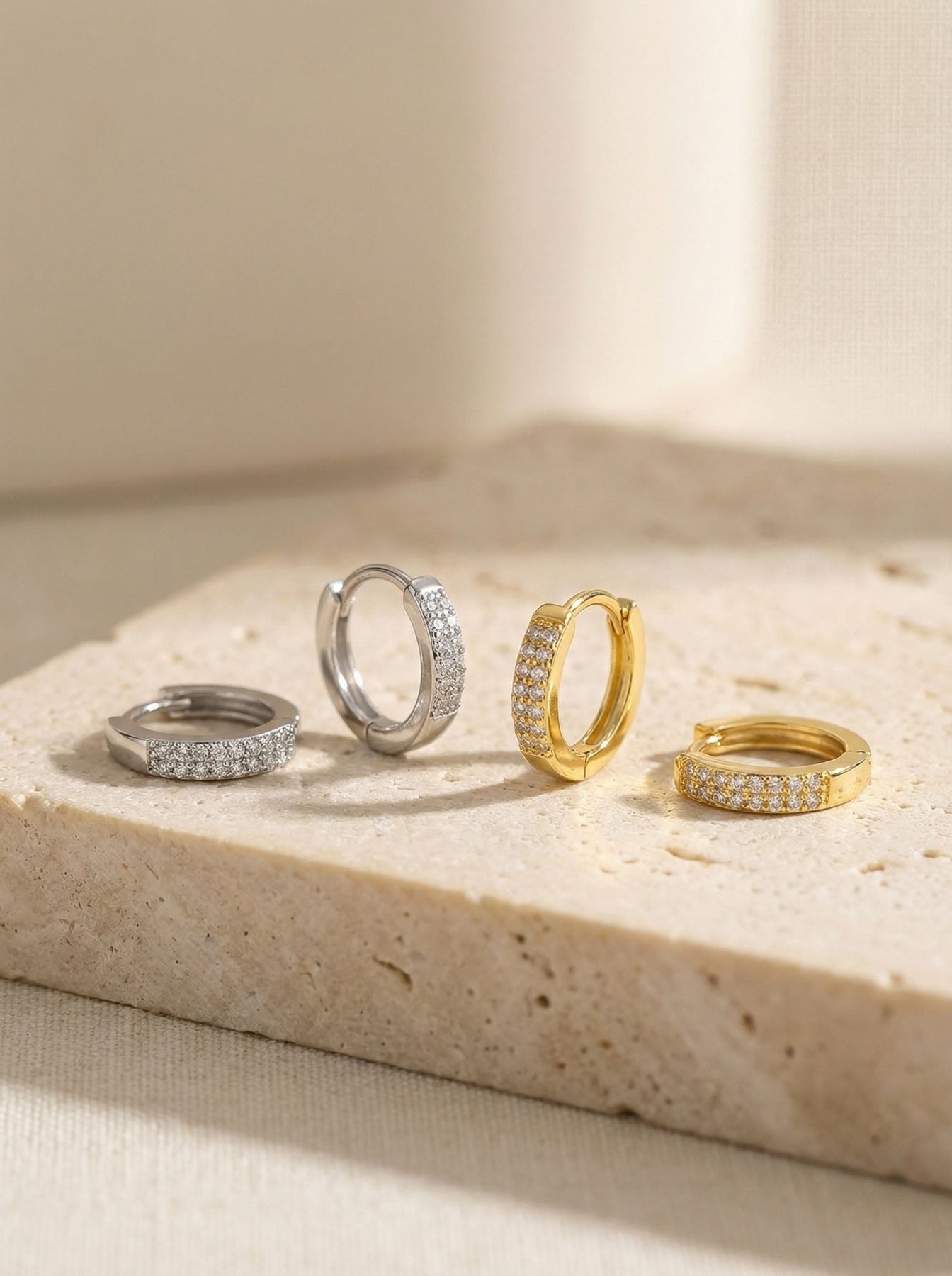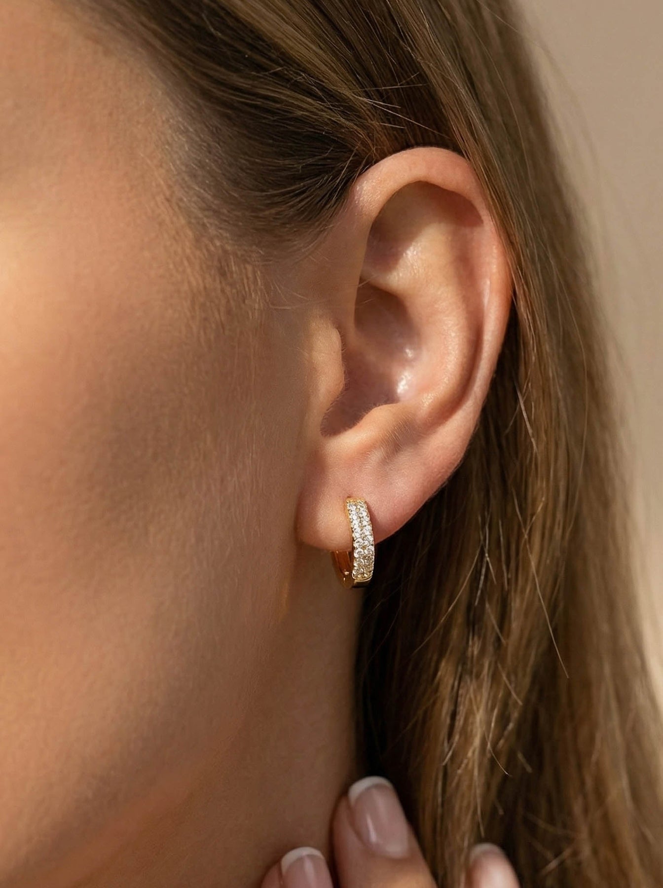 These Pavé Huggie Hoop Earrings are crafted from premium 925 sterling silver. Each hoop is adorned with sparkling cubic zirconia stones arranged in a pavé setting, creating a subtle yet eye-catching sparkle perfect for everyday wear. Lightweight, comfortable, and easy to pair with any outfit, these small gold hoops are a timeless jewelry essential.