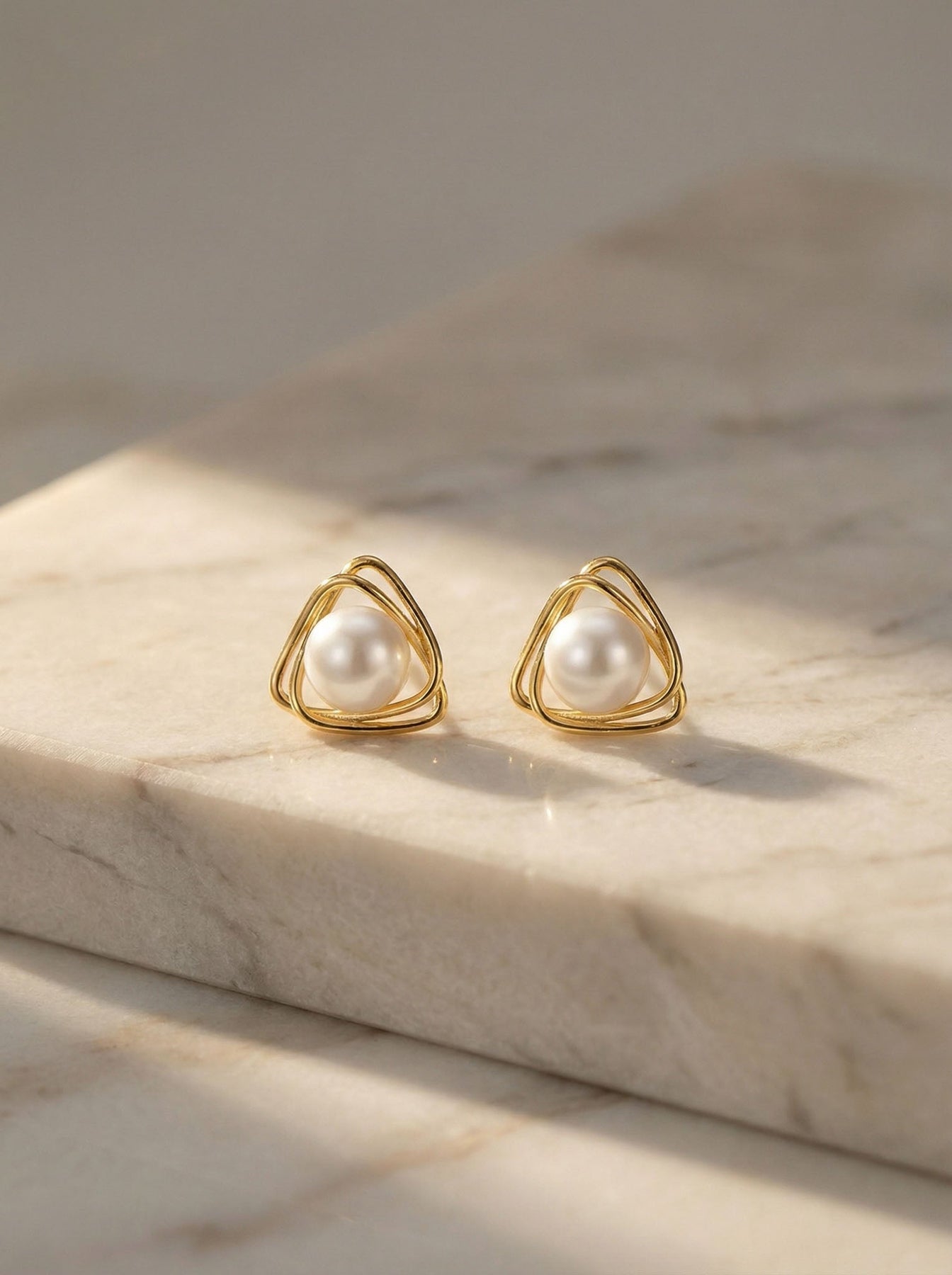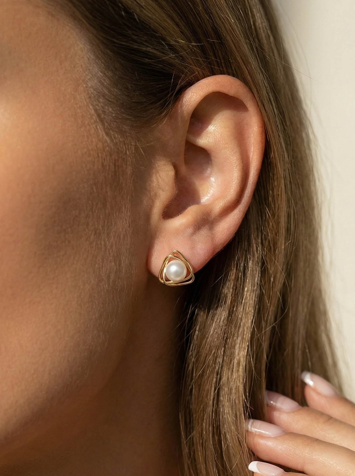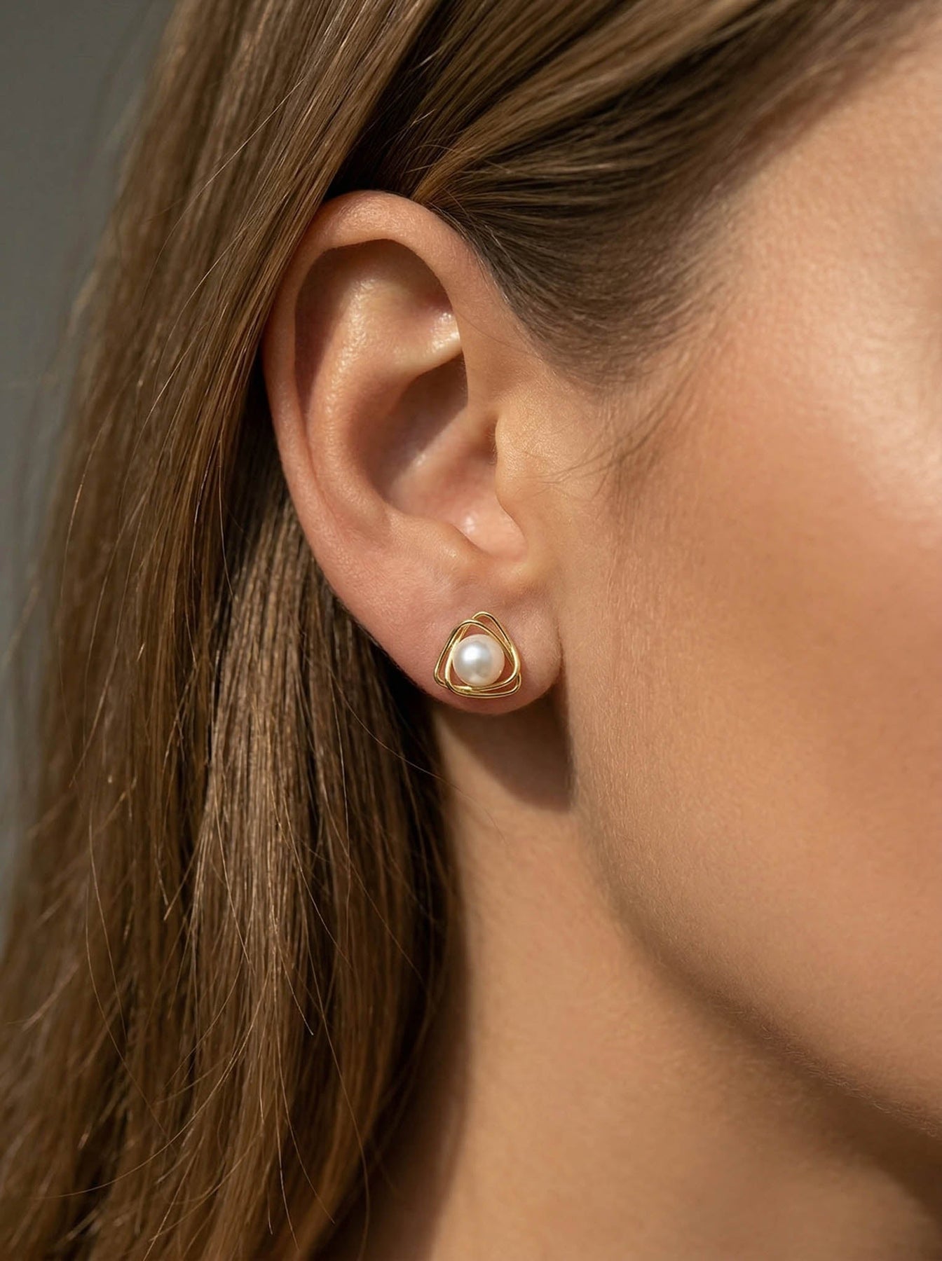These Triangle Frame Pearl Stud Earrings feature a modern geometric triangle outline paired with a delicate freshwater pearl at the center. Crafted from premium 925 sterling silver and finished with a durable gold plating, these earrings combine contemporary design with timeless elegance.