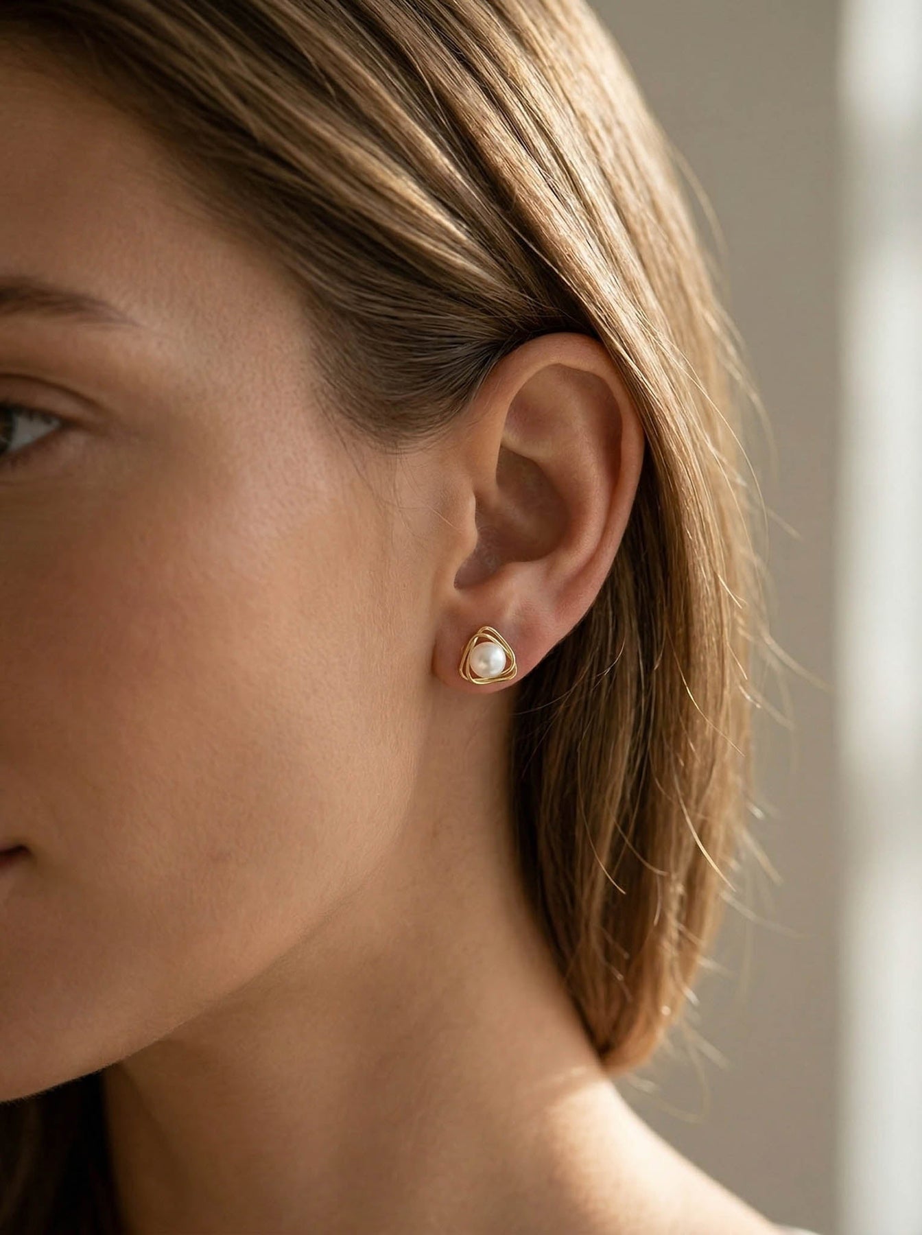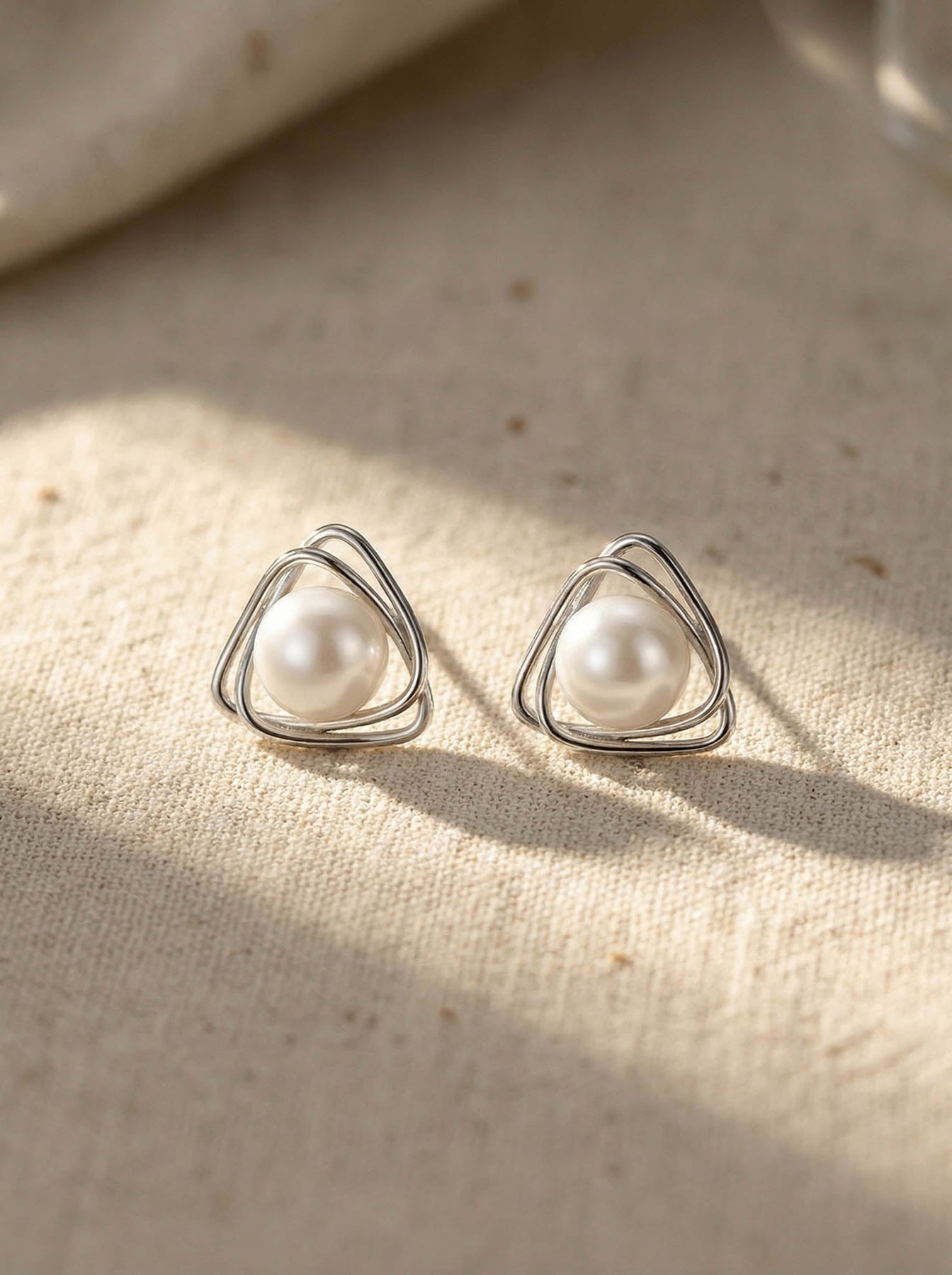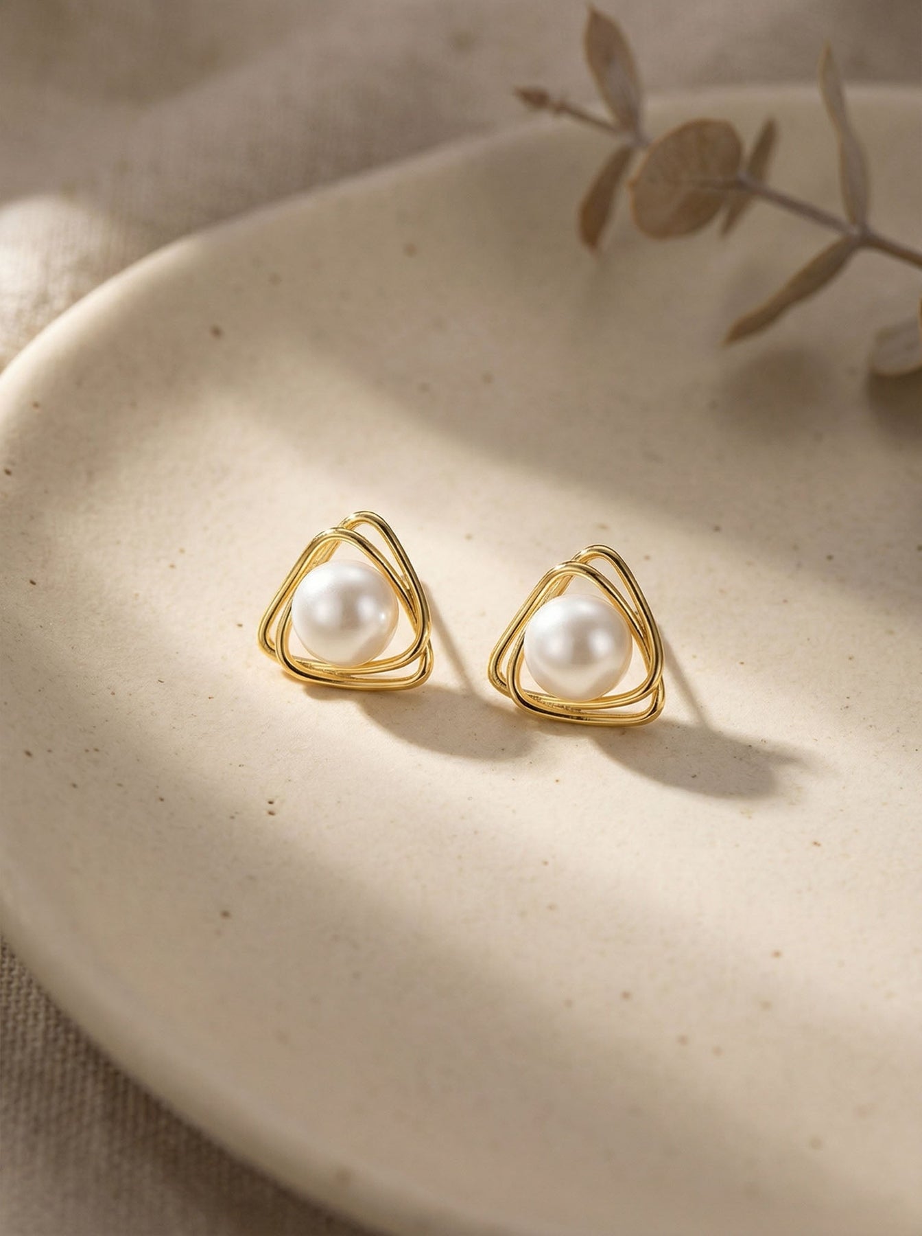 These Triangle Frame Pearl Stud Earrings feature a modern geometric triangle outline paired with a delicate freshwater pearl at the center. Crafted from premium 925 sterling silver and finished with a durable gold plating, these earrings combine contemporary design with timeless elegance.