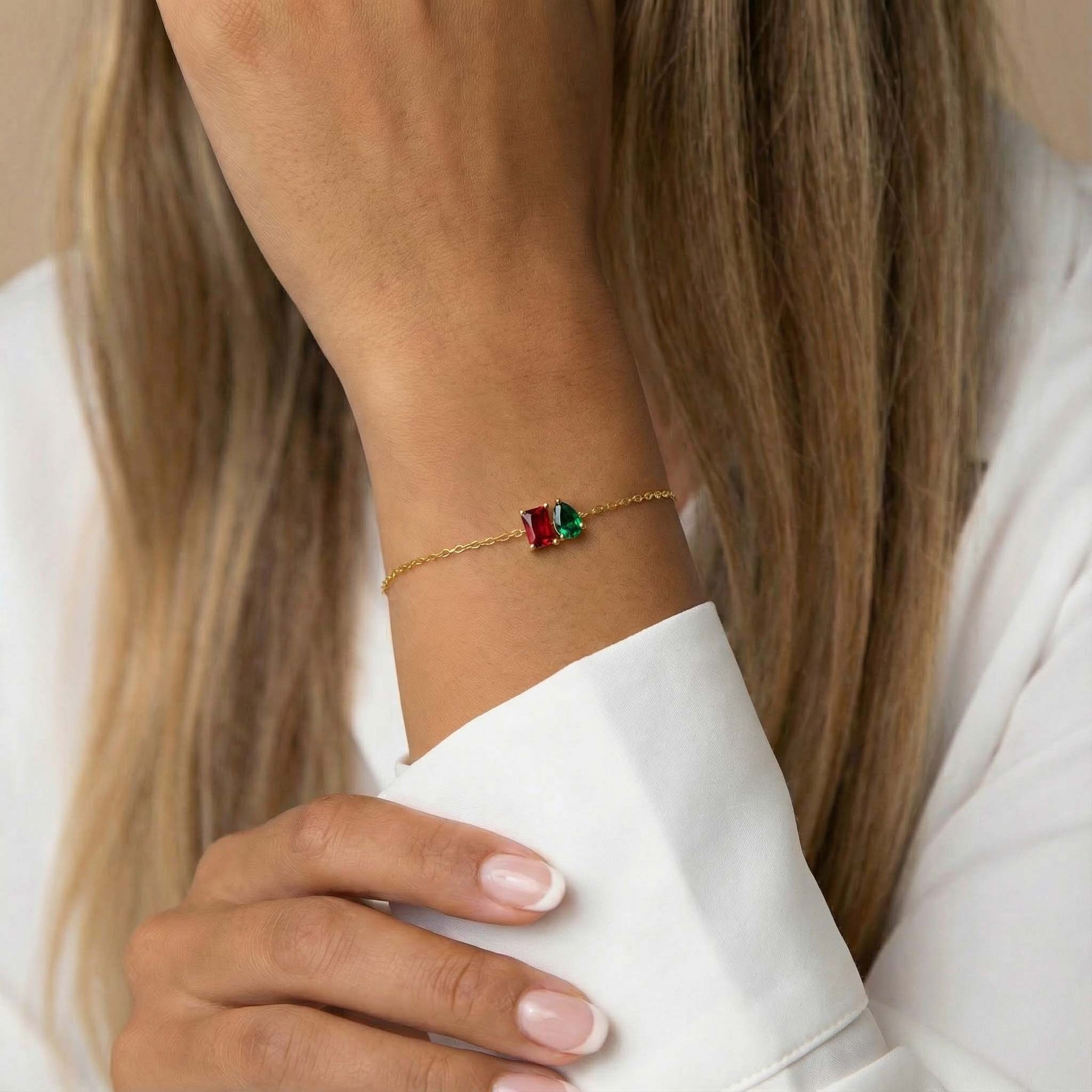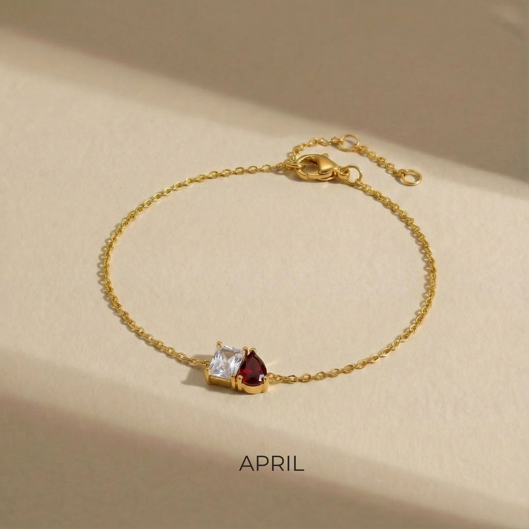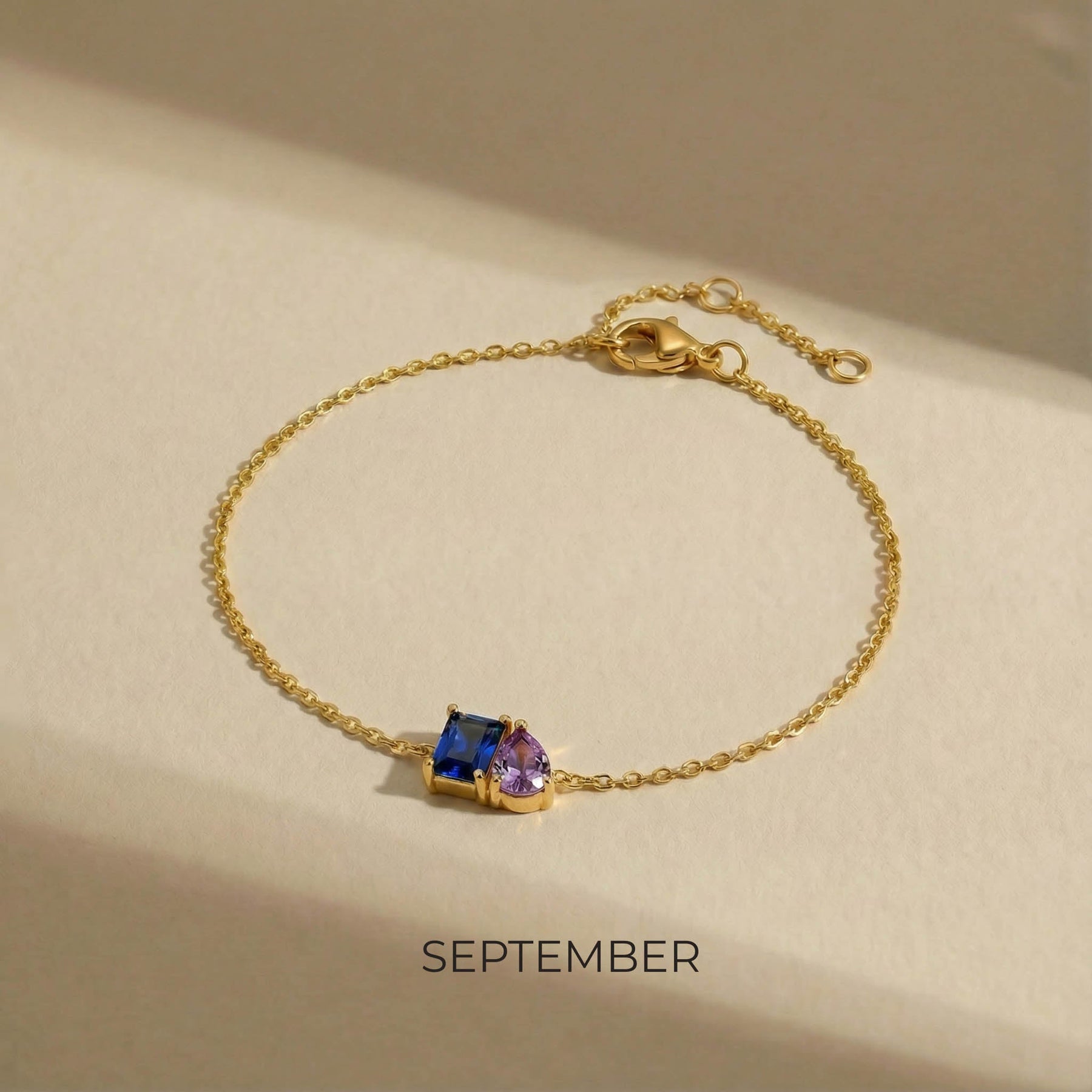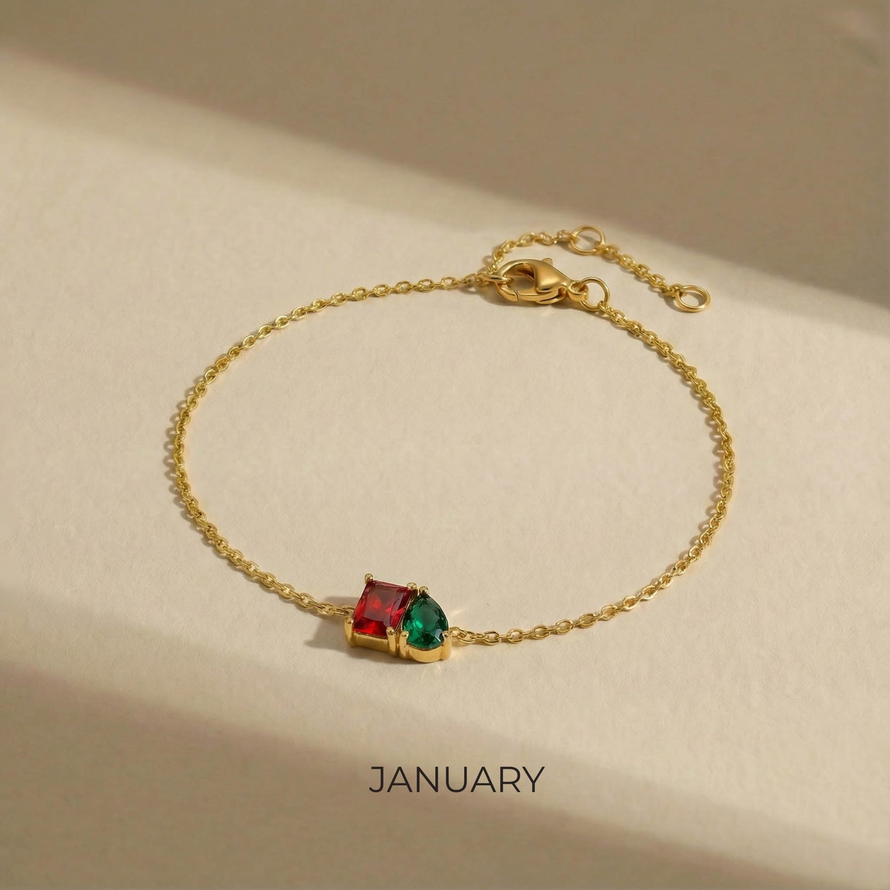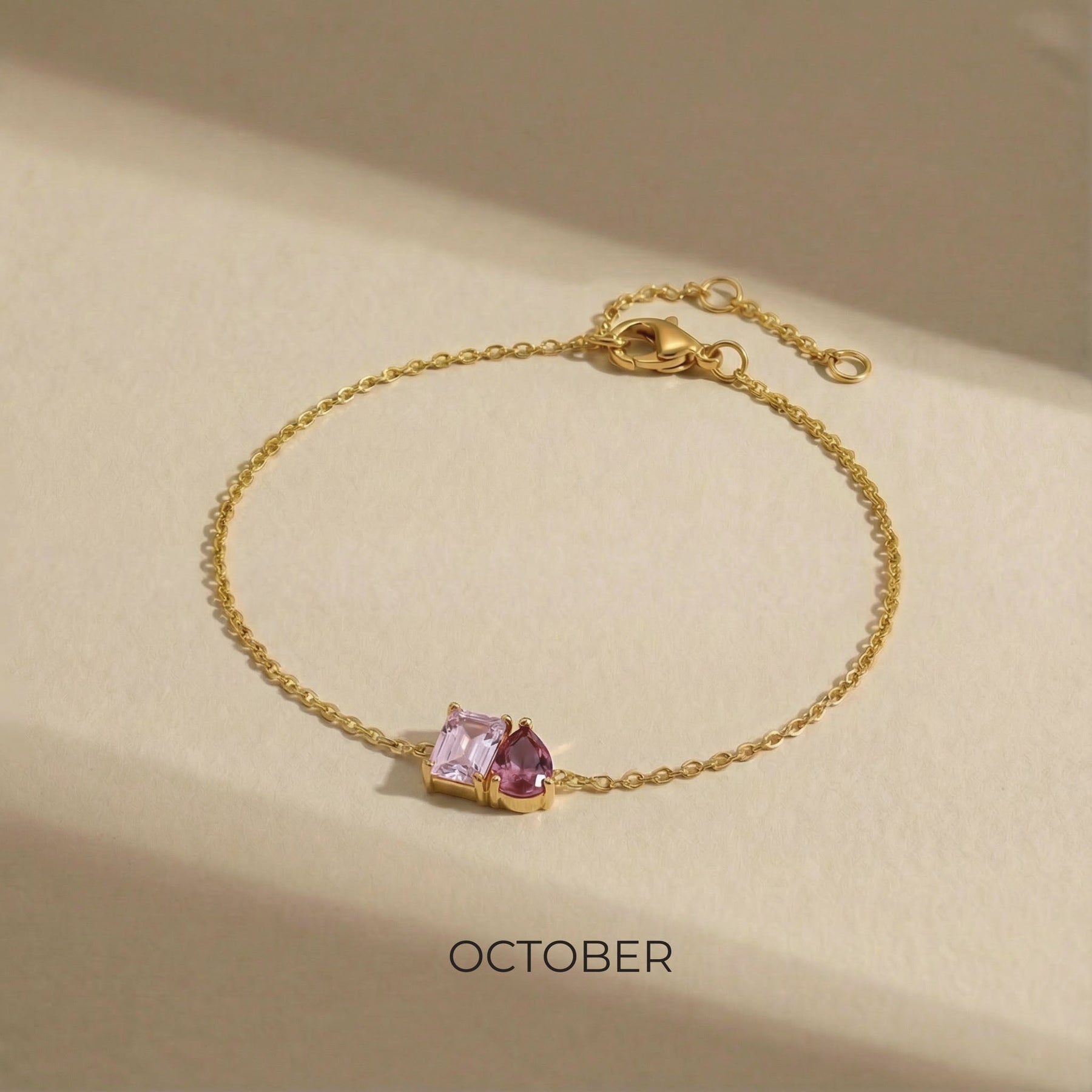 This dainty birthstone bracelet features two gemstones set side by side on a delicate gold chain. A meaningful and elegant way to represent loved ones, it’s perfect for stacking or wearing solo. Ideal as a thoughtful gift for birthdays, anniversaries, or just to keep someone close to your heart.