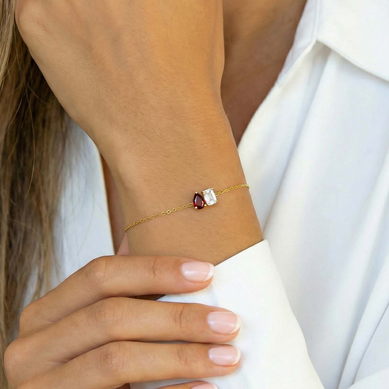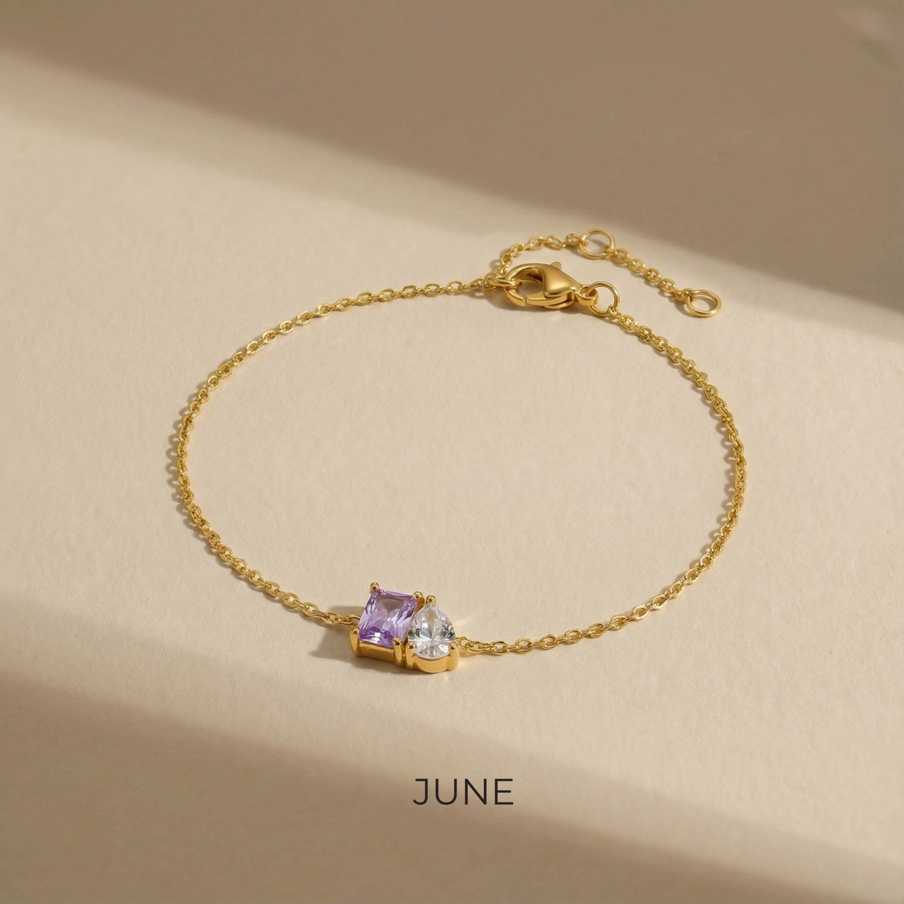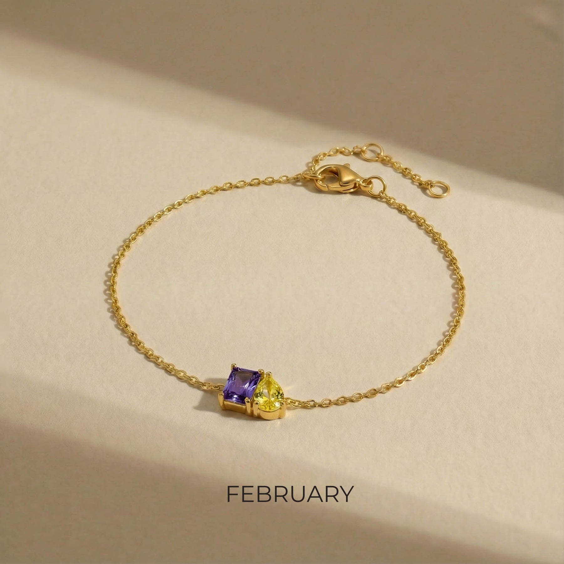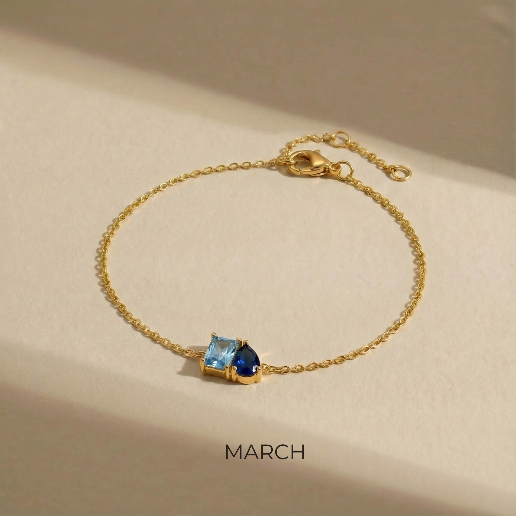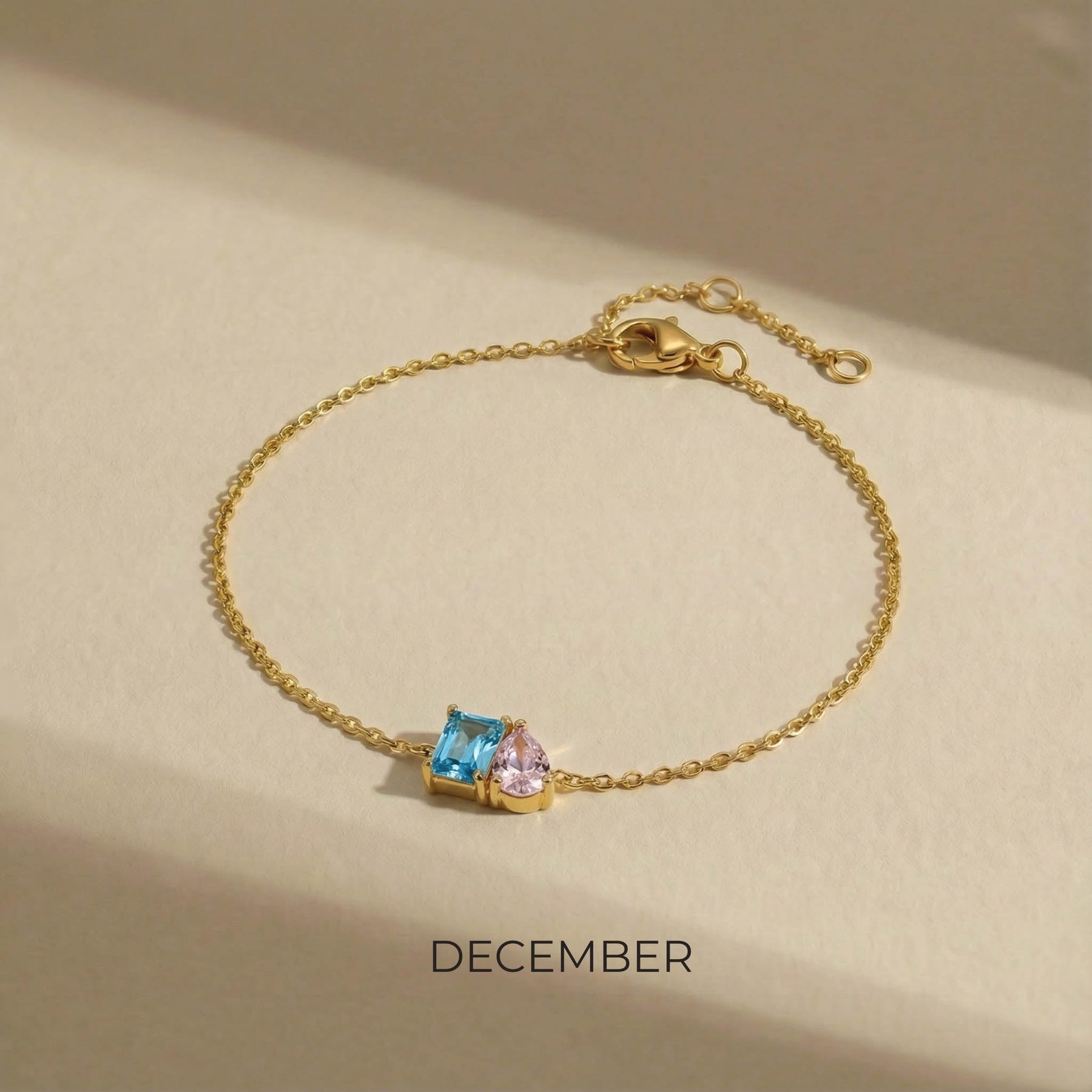 This dainty birthstone bracelet features two gemstones set side by side on a delicate gold chain. A meaningful and elegant way to represent loved ones, it’s perfect for stacking or wearing solo. Ideal as a thoughtful gift for birthdays, anniversaries, or just to keep someone close to your heart.