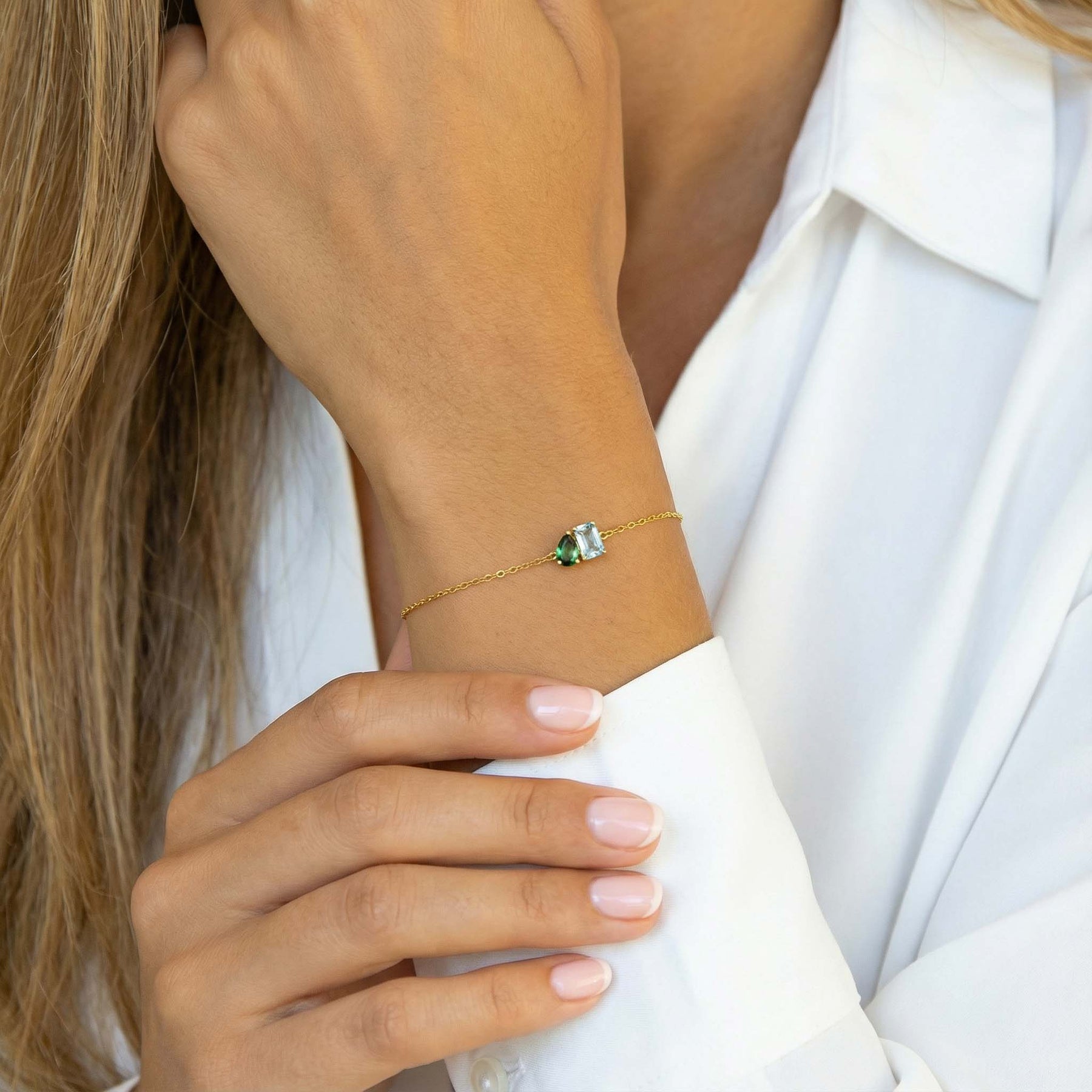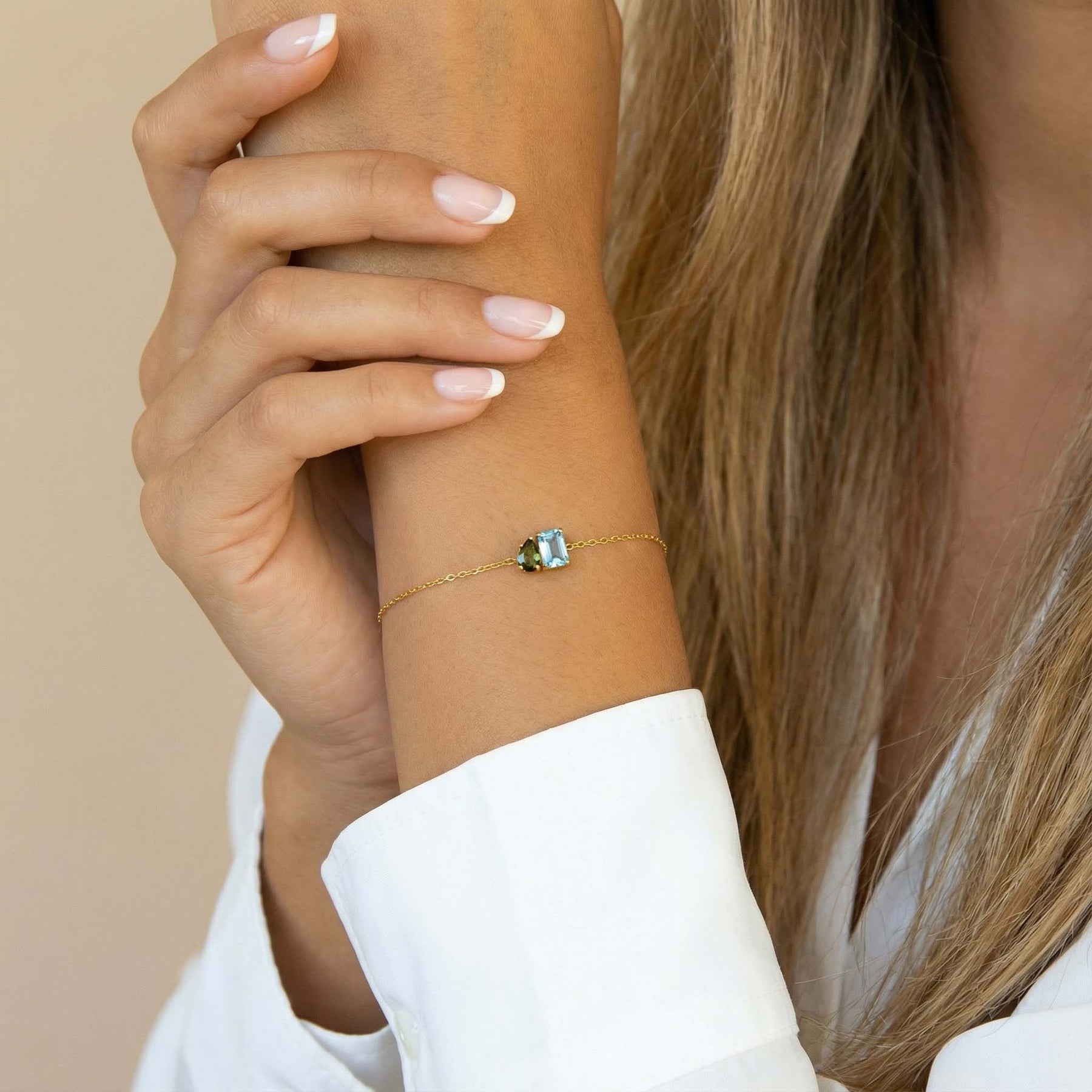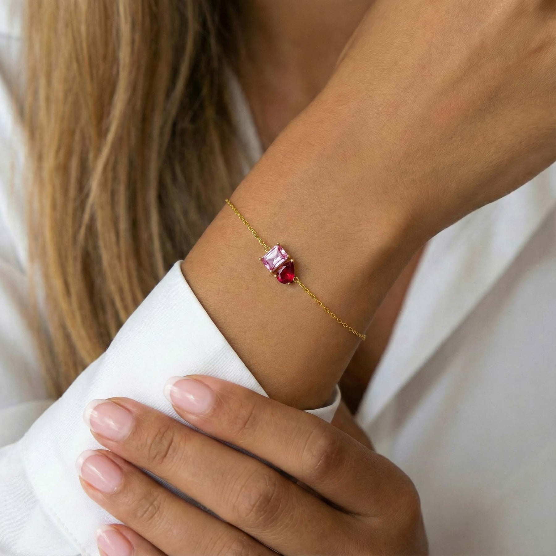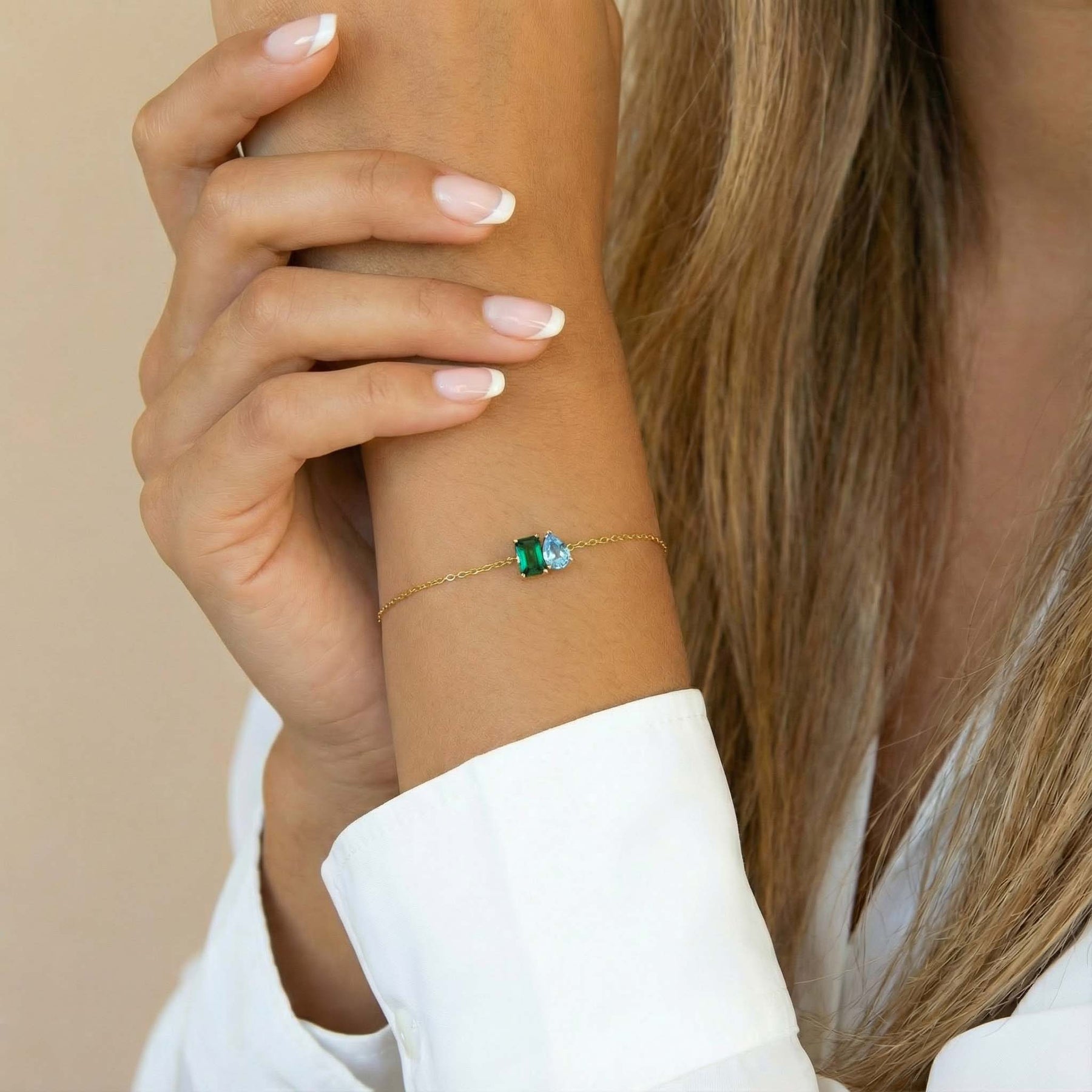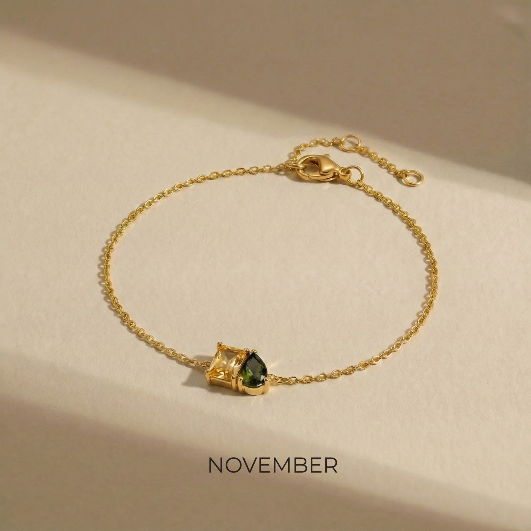 This dainty birthstone bracelet features two gemstones set side by side on a delicate gold chain. A meaningful and elegant way to represent loved ones, it’s perfect for stacking or wearing solo. Ideal as a thoughtful gift for birthdays, anniversaries, or just to keep someone close to your heart.