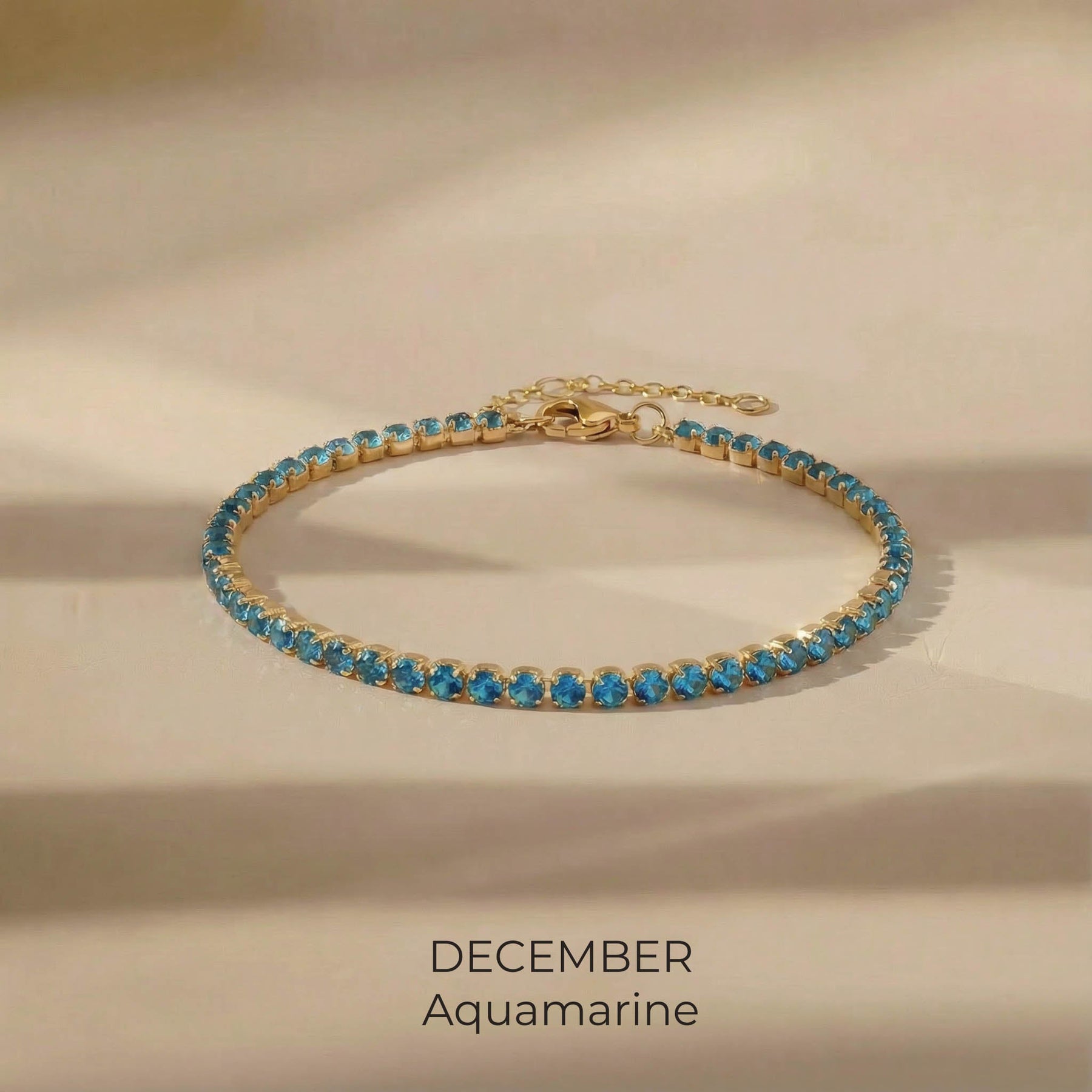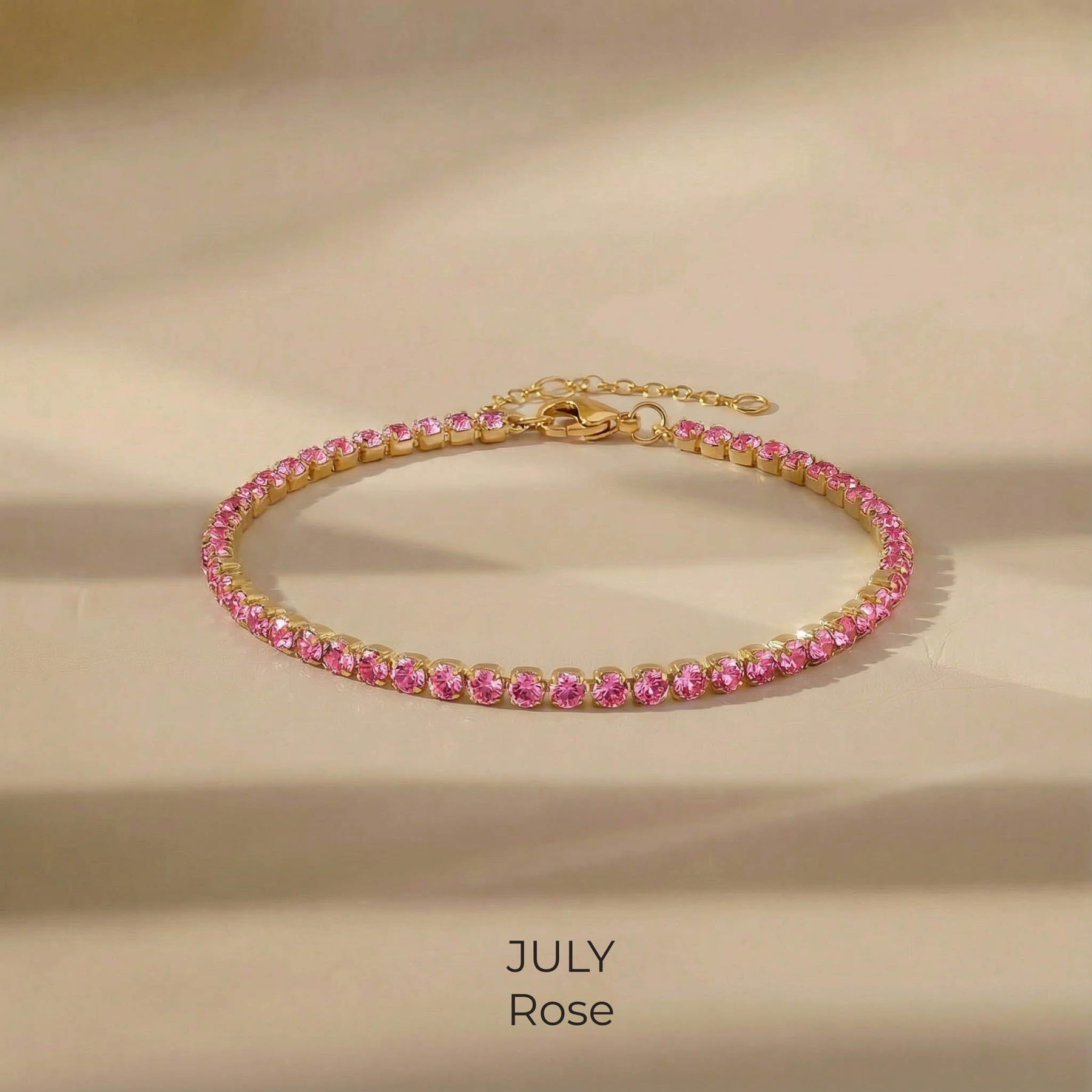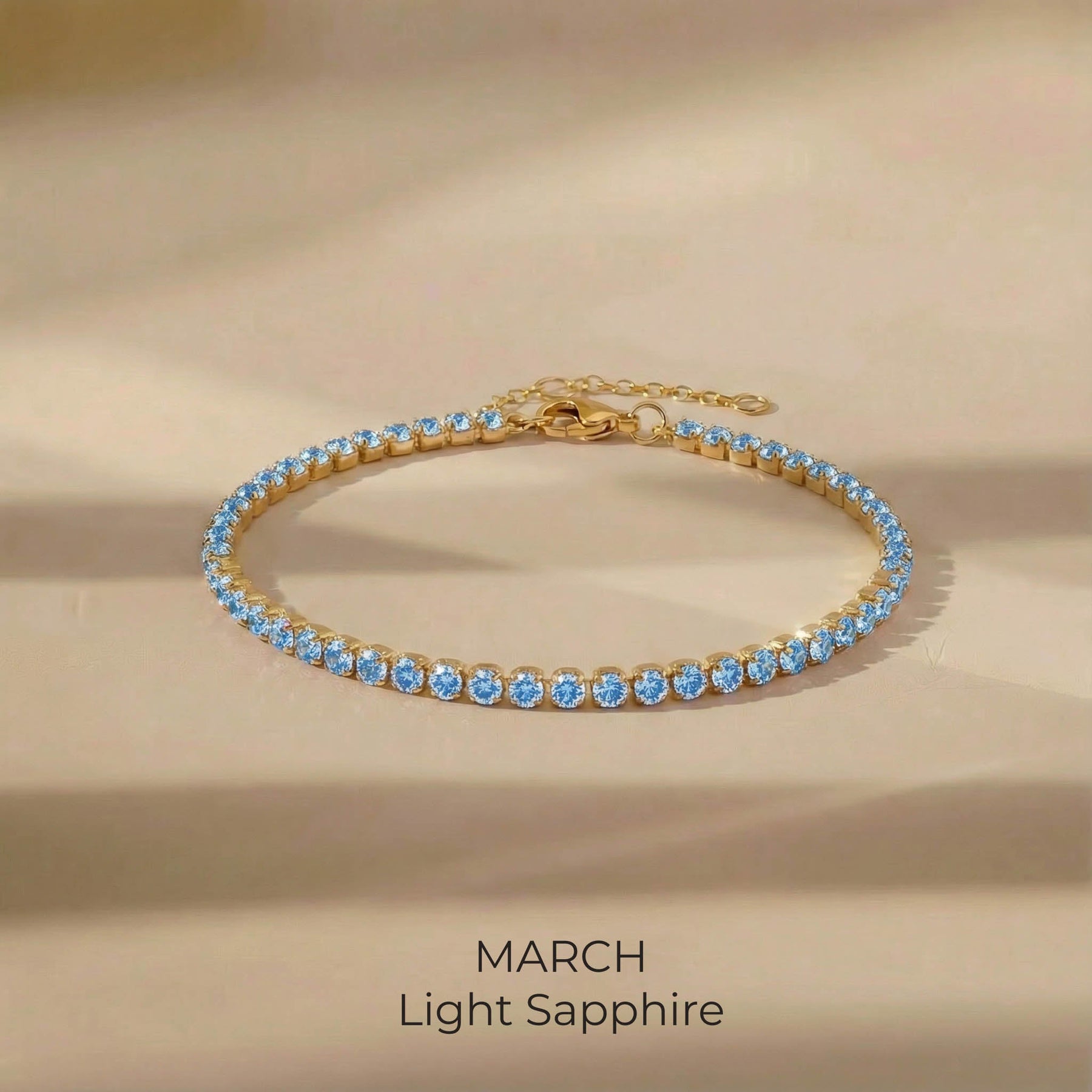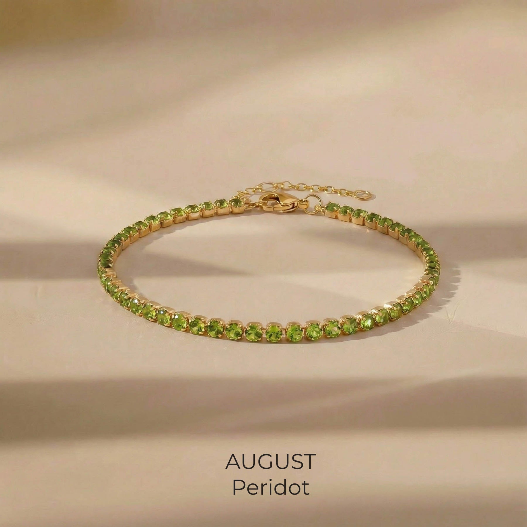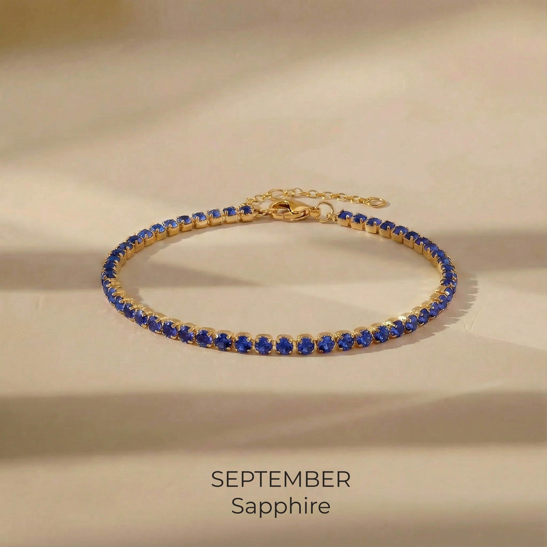 This Birthstone Tennis Bracelet is a timeless piece designed to be worn every day and cherished forever. Set with perfectly aligned, shimmering birthstone crystals, it catches the light beautifully while keeping a refined, delicate look on the wrist.