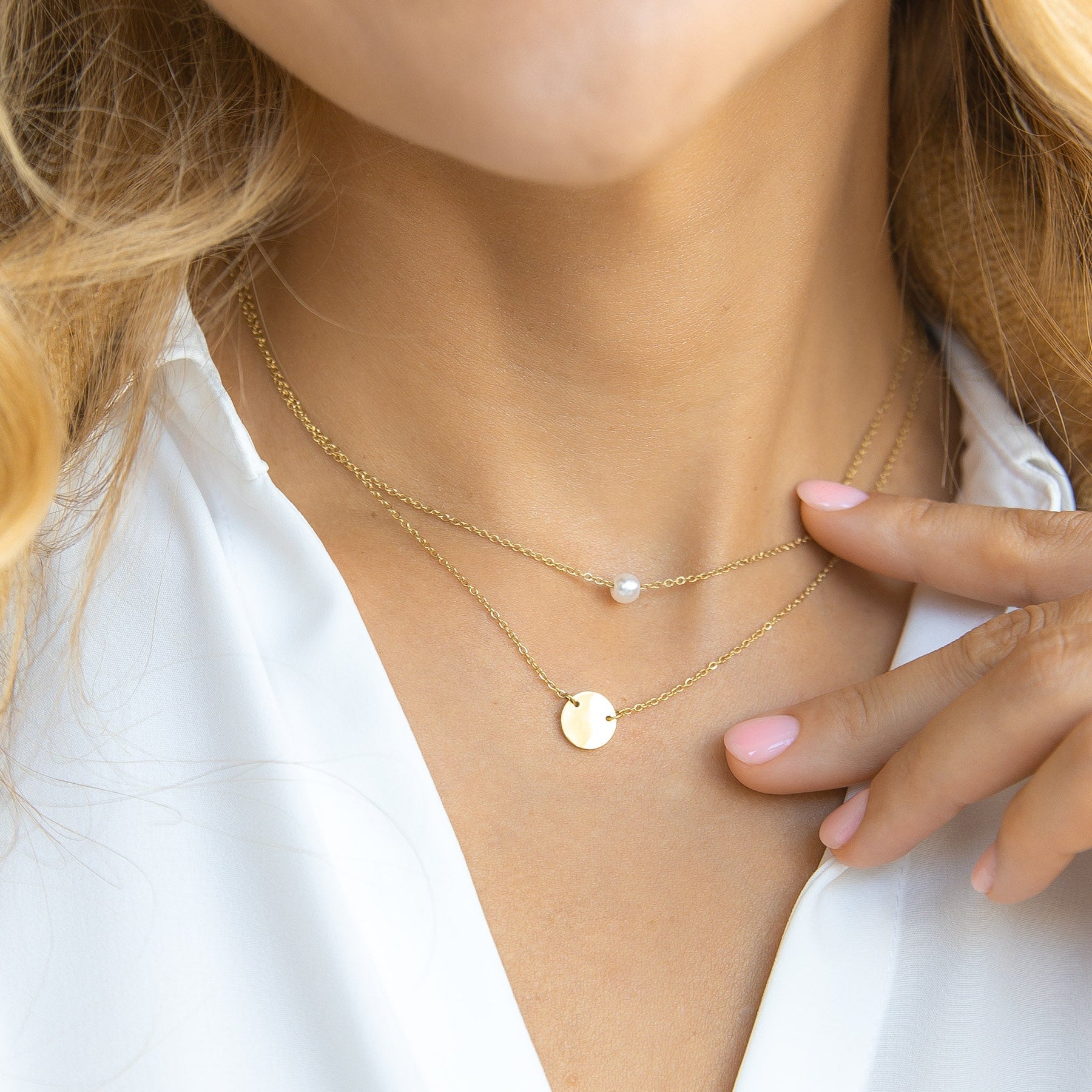 Layered necklaces are extremely on trend right now within all fashion circles and we created our collection of already layered accessories for you. We are obsessed with this chic set. This double chain set features a pearl choker and tiny disc necklaces!