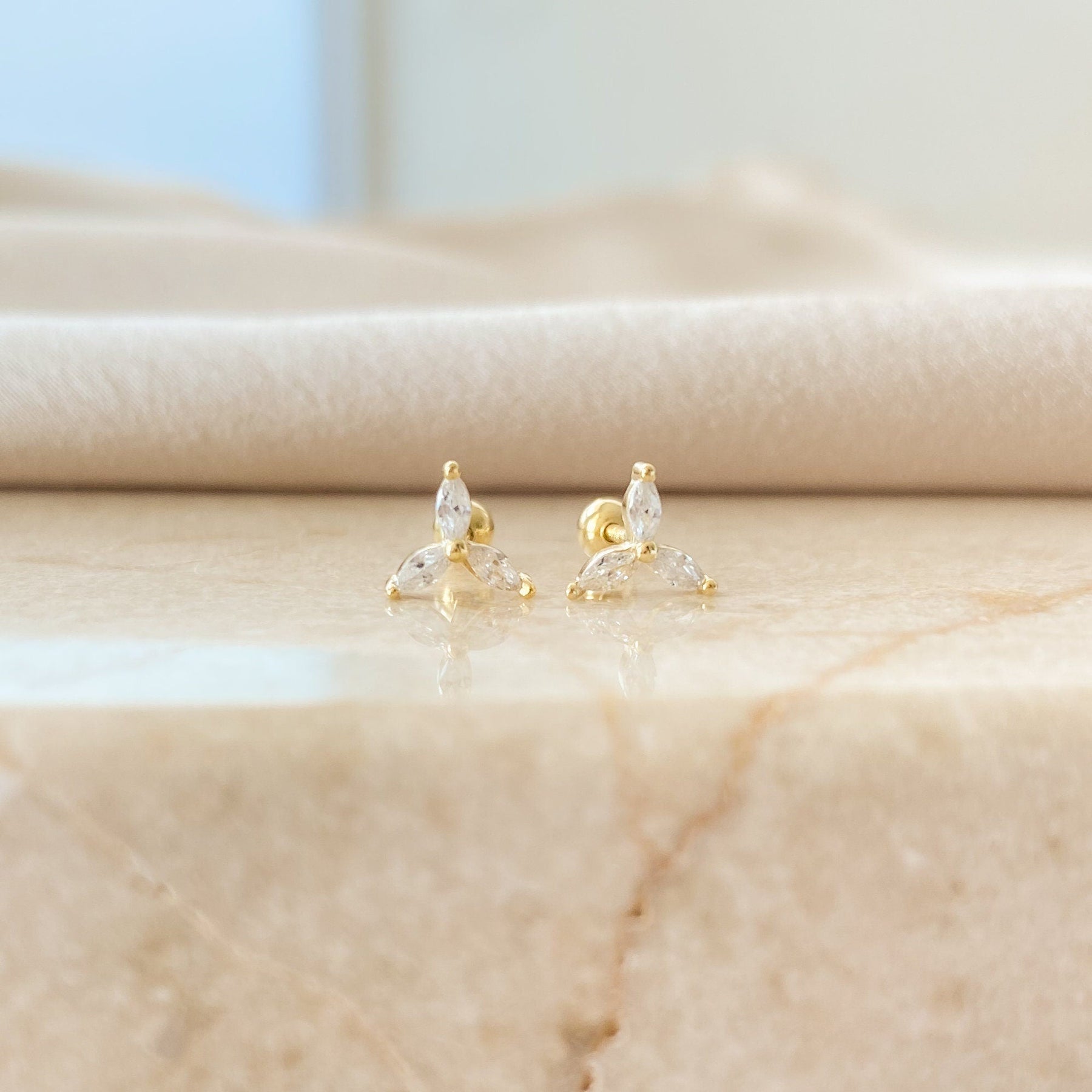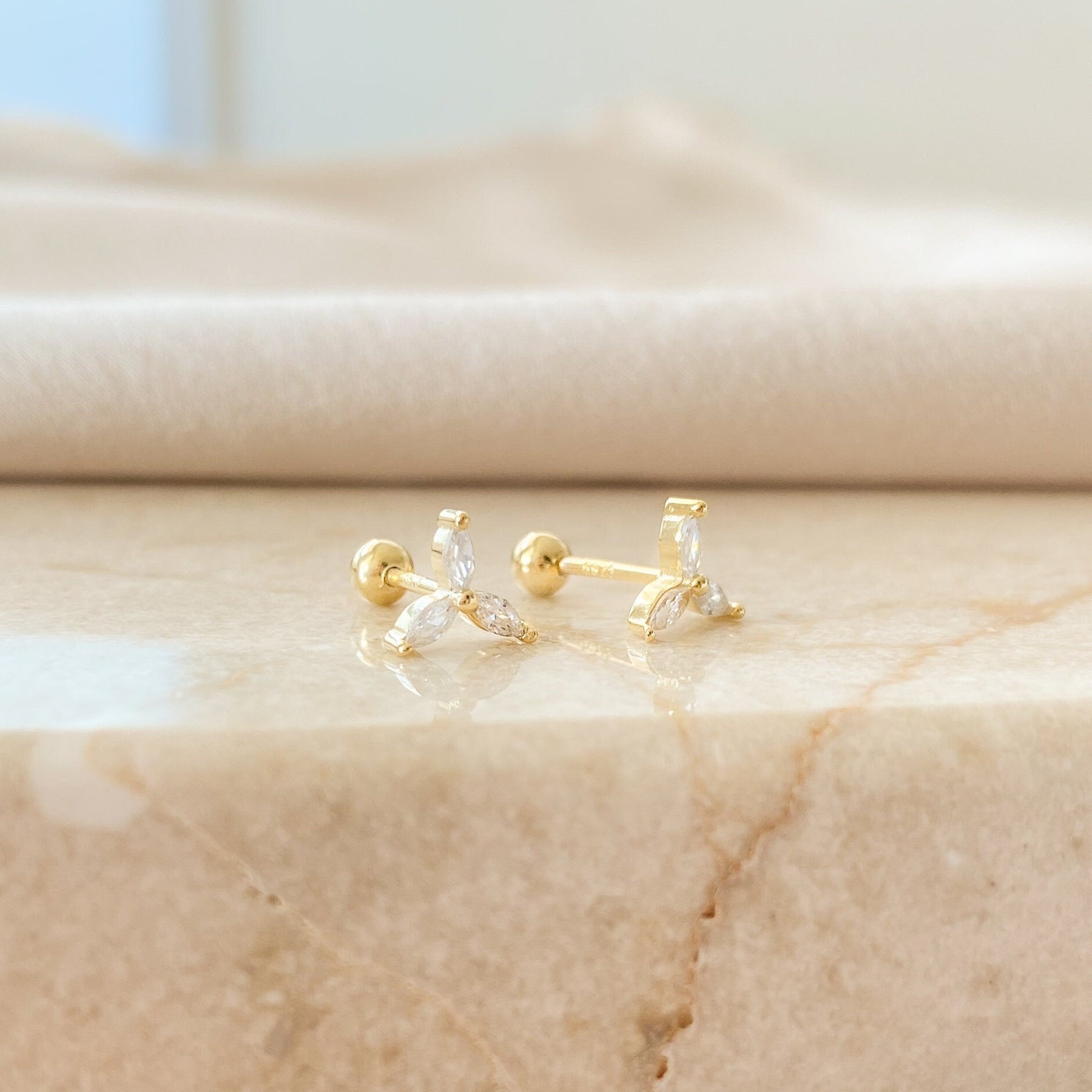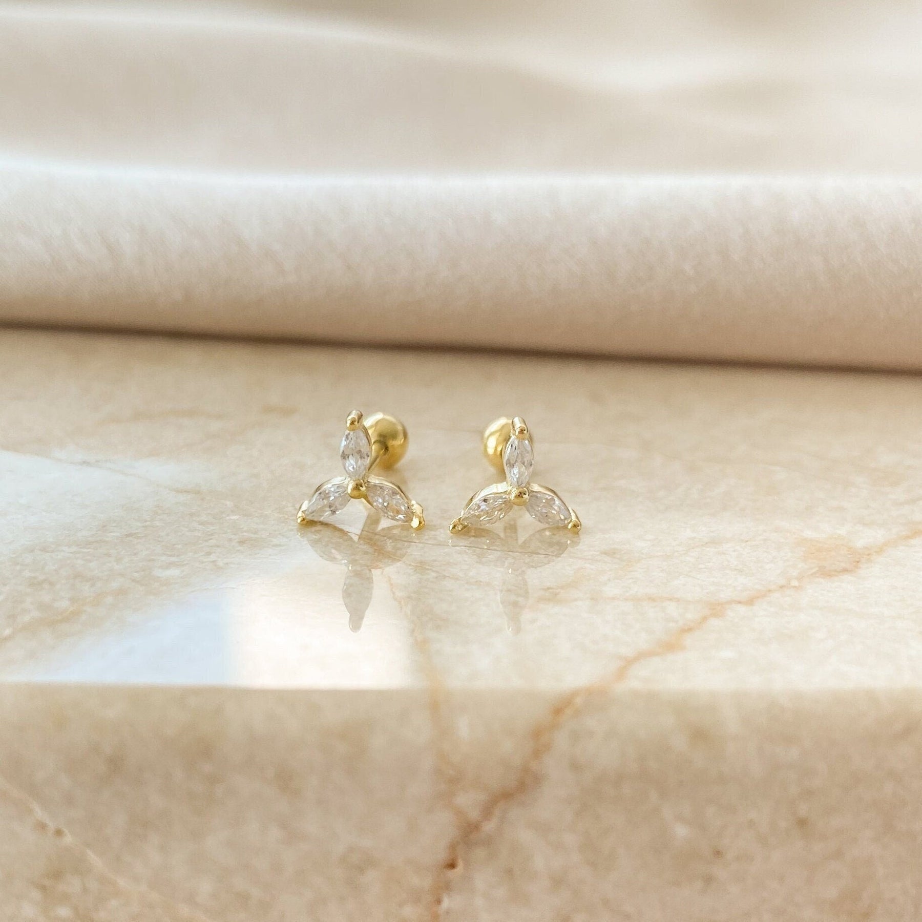These Dainty Flower Earrings With Diamonds offer a delicate, feminine sparkle perfect for everyday elegance. Crafted from premium 925 sterling silver, each stud features three marquise-cut cubic zirconia stones arranged in a refined floral shape, creating a radiant and polished look.