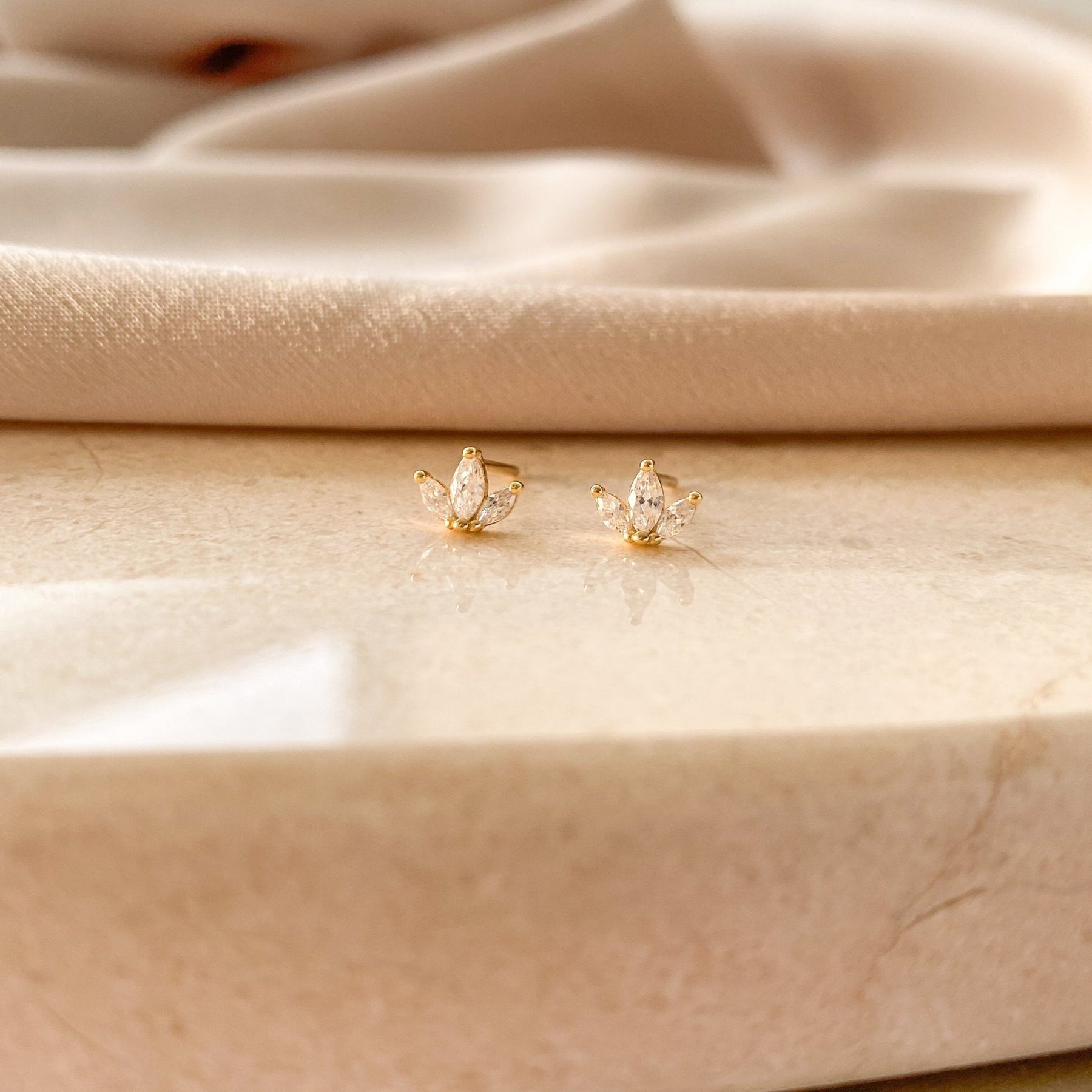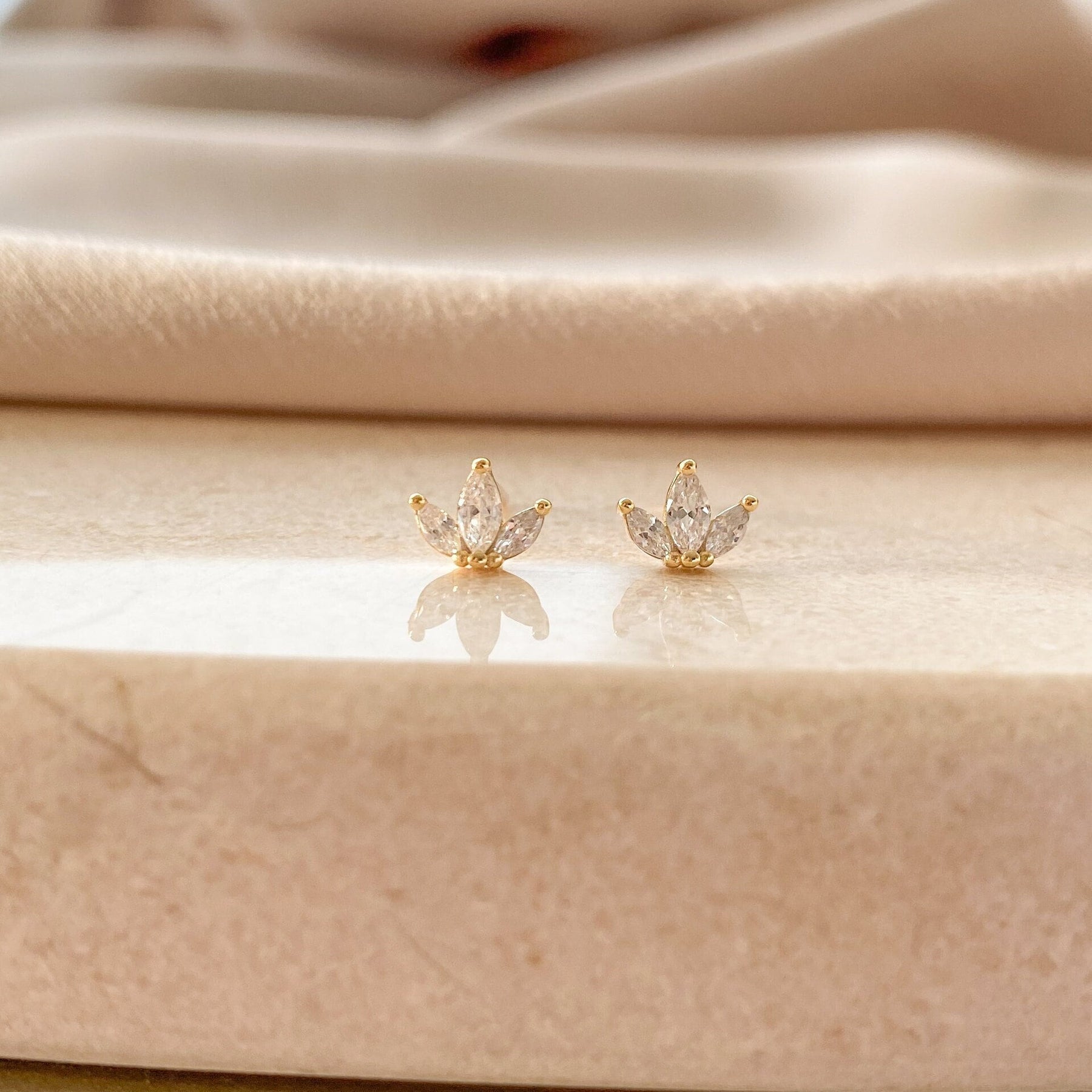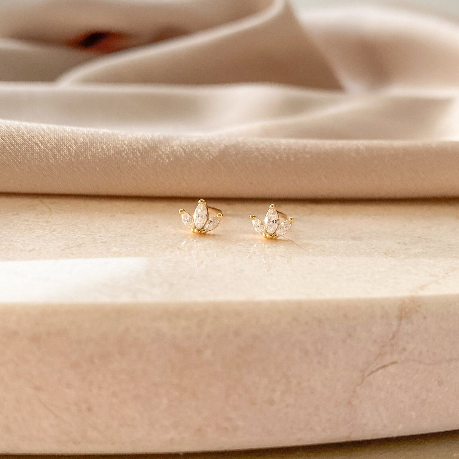 These elegant Diamond Stud Earrings feature three sparkling marquise-cut cubic zirconia stones arranged in a refined crown-like design. Crafted from premium 925 sterling silver and finished with high-quality gold plating, they offer a luxurious shine while remaining lightweight and comfortable for everyday wear.