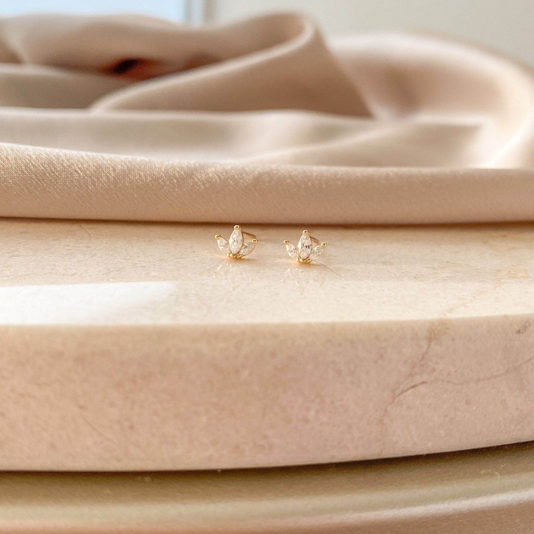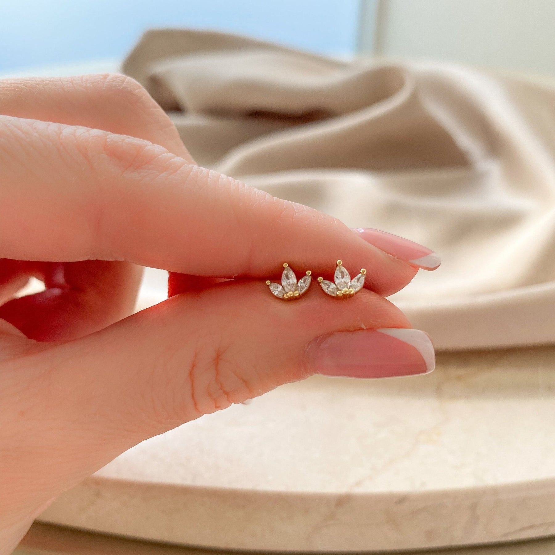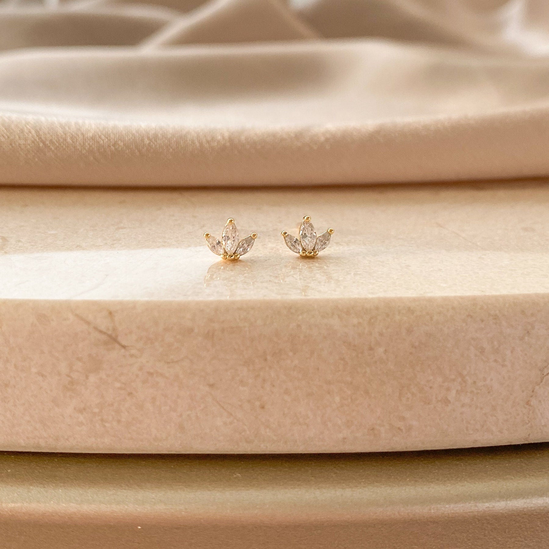 These elegant Diamond Stud Earrings feature three sparkling marquise-cut cubic zirconia stones arranged in a refined crown-like design. Crafted from premium 925 sterling silver and finished with high-quality gold plating, they offer a luxurious shine while remaining lightweight and comfortable for everyday wear.