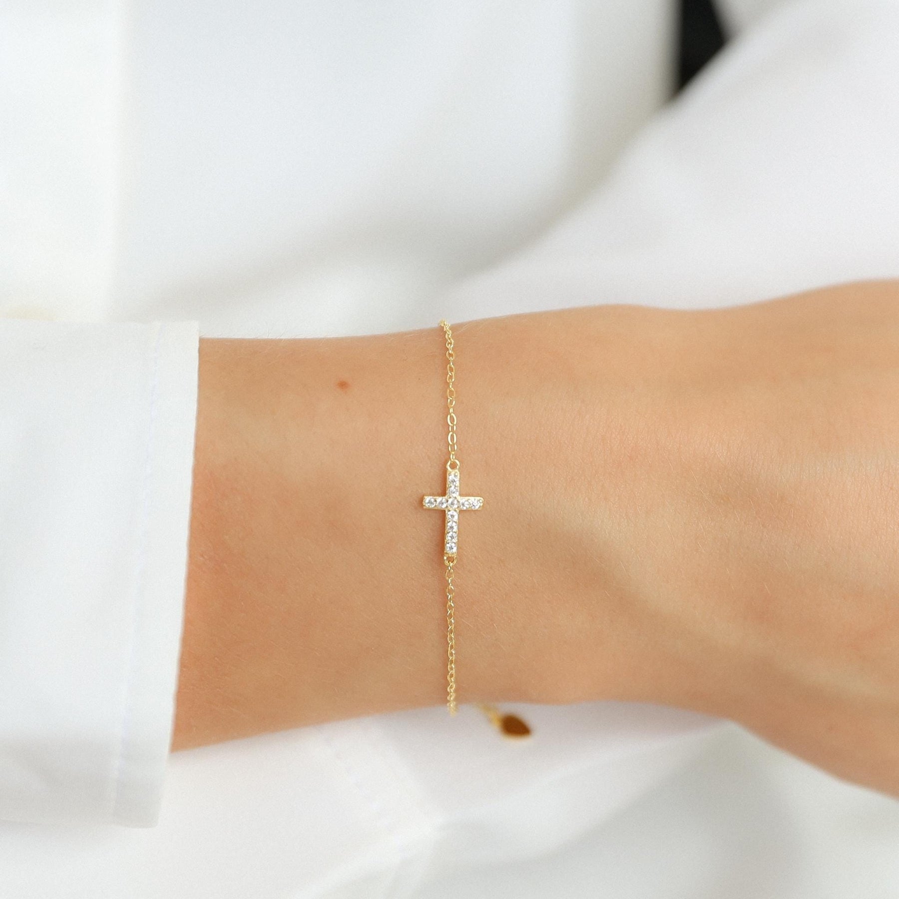 Elevate your everyday style with this elegant Gold Cross Bracelet crafted from high-quality 925 sterling silver and finished with a radiant gold plating. The bracelet features a delicate sideways cross charm adorned with sparkling cubic zirconia stones, symbolizing faith, protection, and timeless beauty.