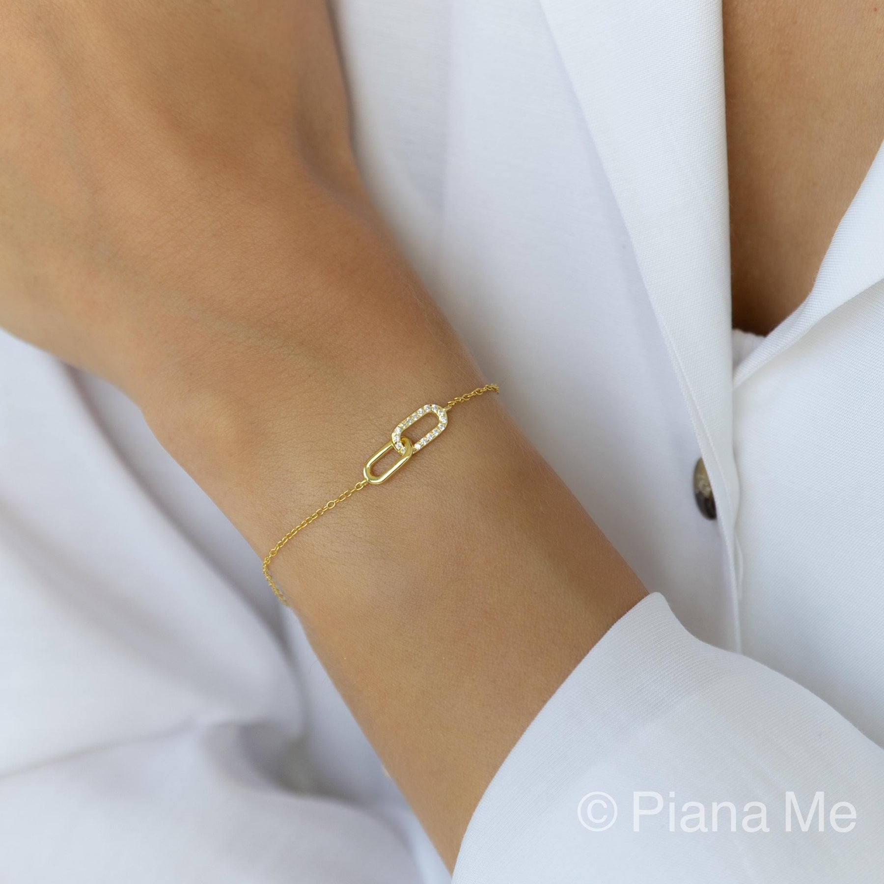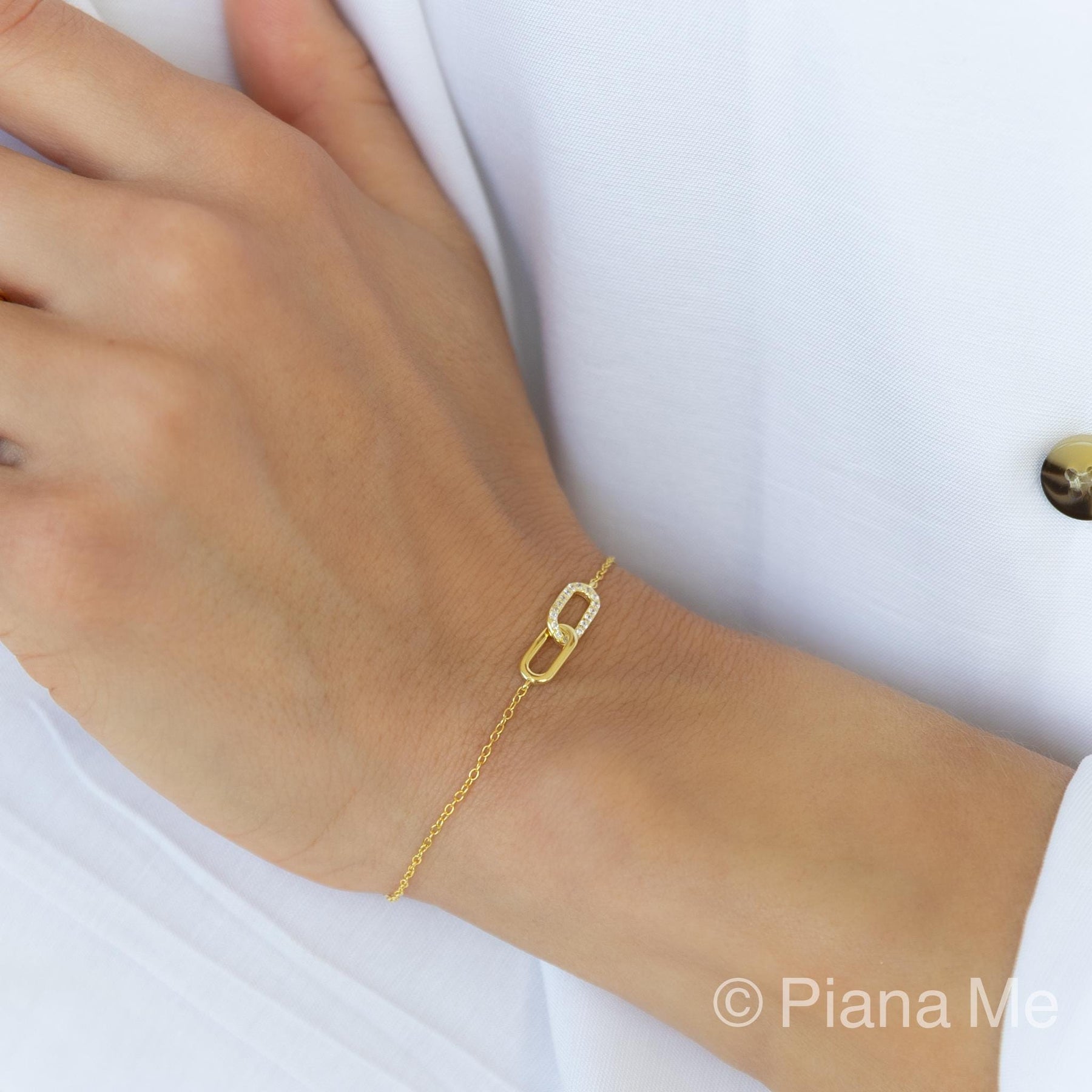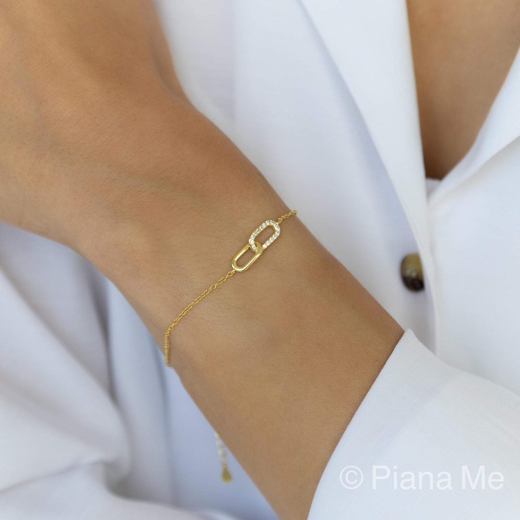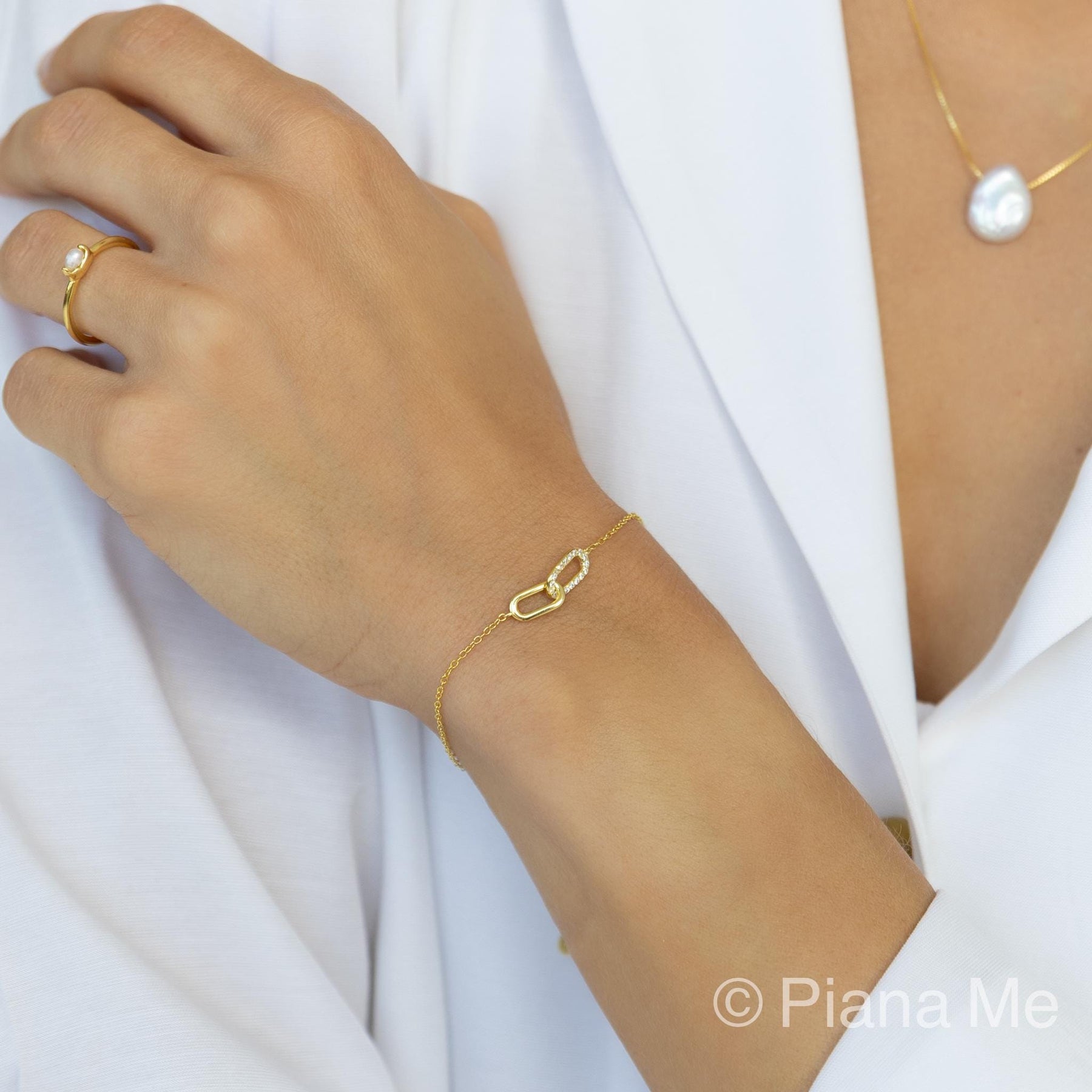 This Interlocking Bracelet features a modern, elegant design with two interlinked charms—one polished gold-plated and the other adorned with sparkling diamond-like cubic zirconia crystals. Crafted from high-quality 925 sterling silver, this bracelet adds a refined and timeless touch to any jewelry collection.