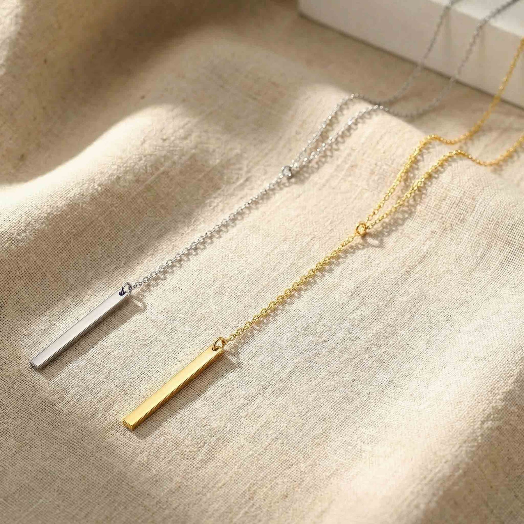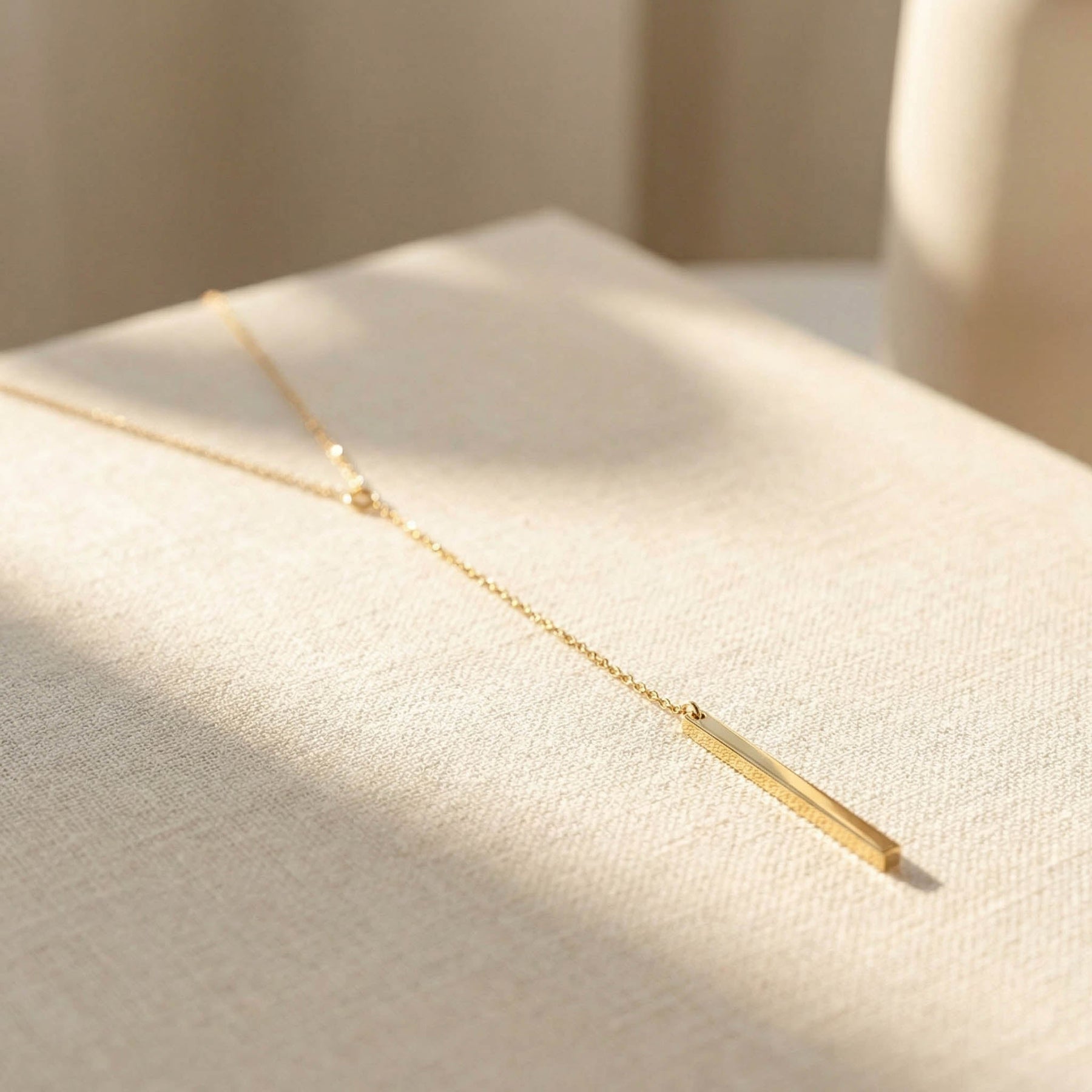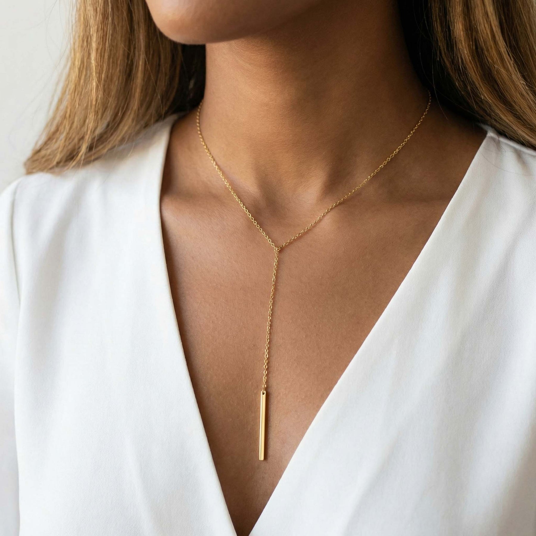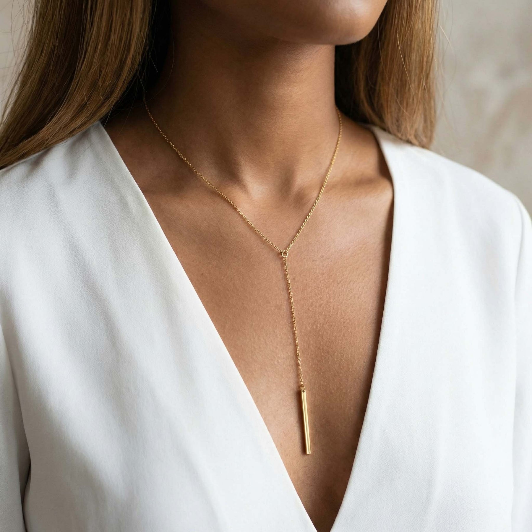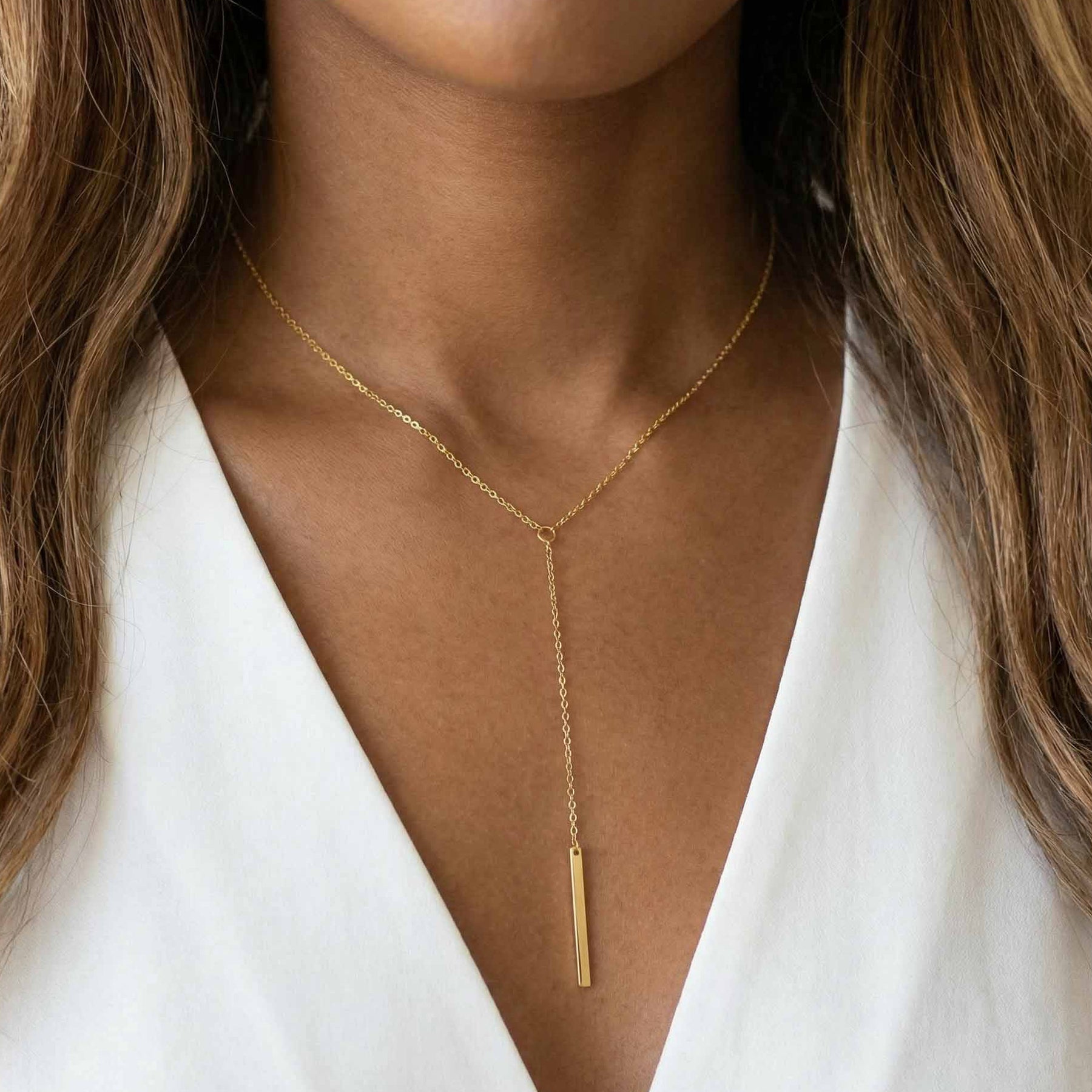 Modern, Trendy, Simple Necklace. Our Y style Necklace hangs on a Y-shaped chain. Available in 18K Gold, Rose Gold or Silver finish. Super versatile piece that looks great on it's own, or layers nicely with others.